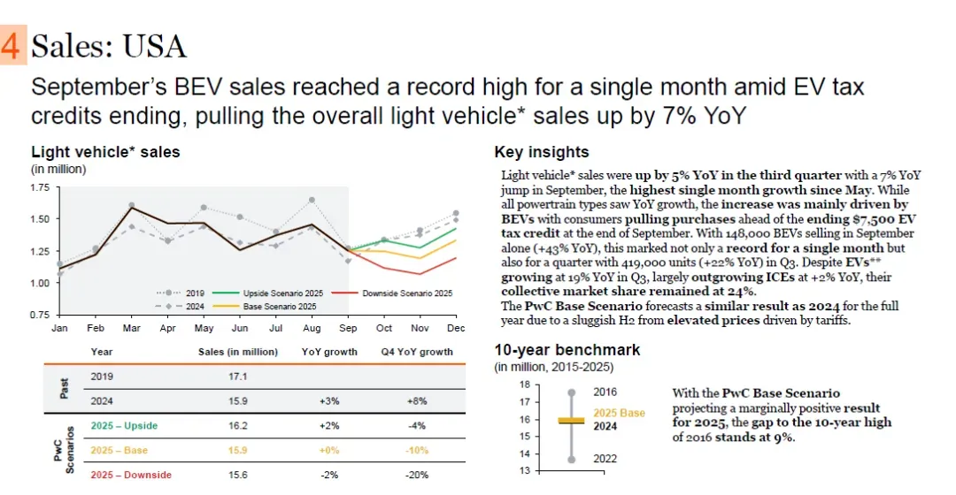 尽管第三季度EV销量同比增长19%,远超ICE的2%,但EV整体市场份额仍保持在24%。普华永道基础情景预测,受关税导致价格上涨的影响,2025年美国轻型汽车全年销量与2024年基本持平。