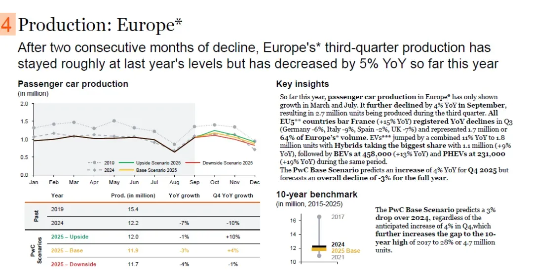 普华永道基础情景预测,2025年第四季度欧洲乘用车产量同比增长4%,但全年产量同比下降3%。