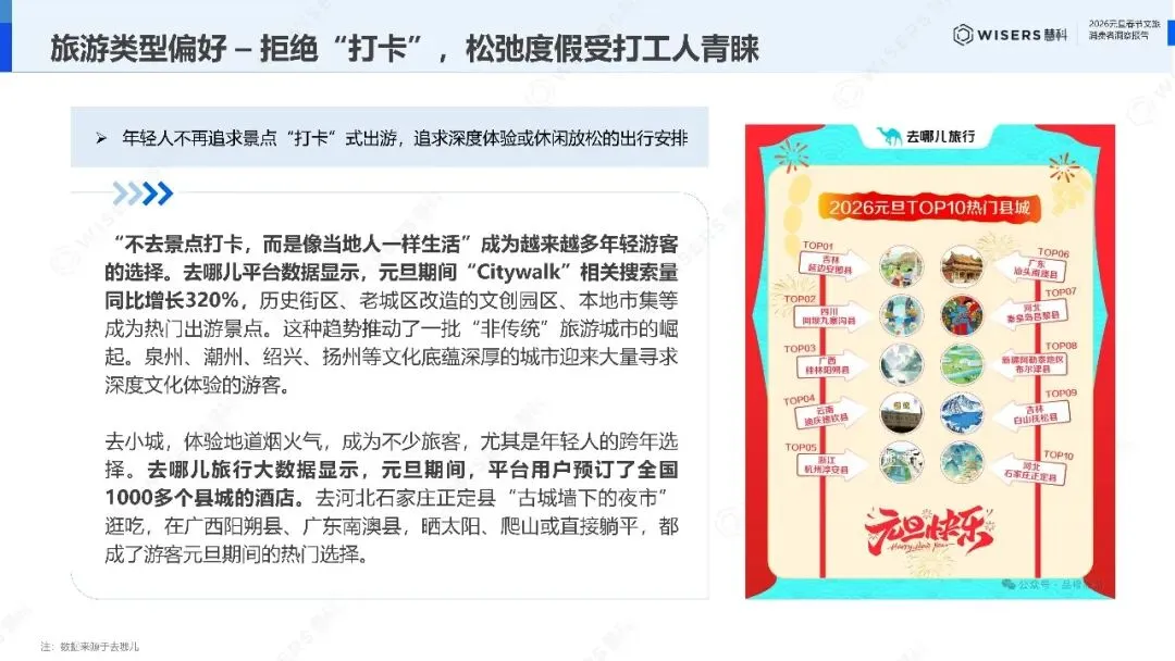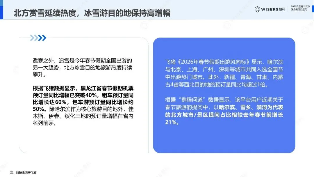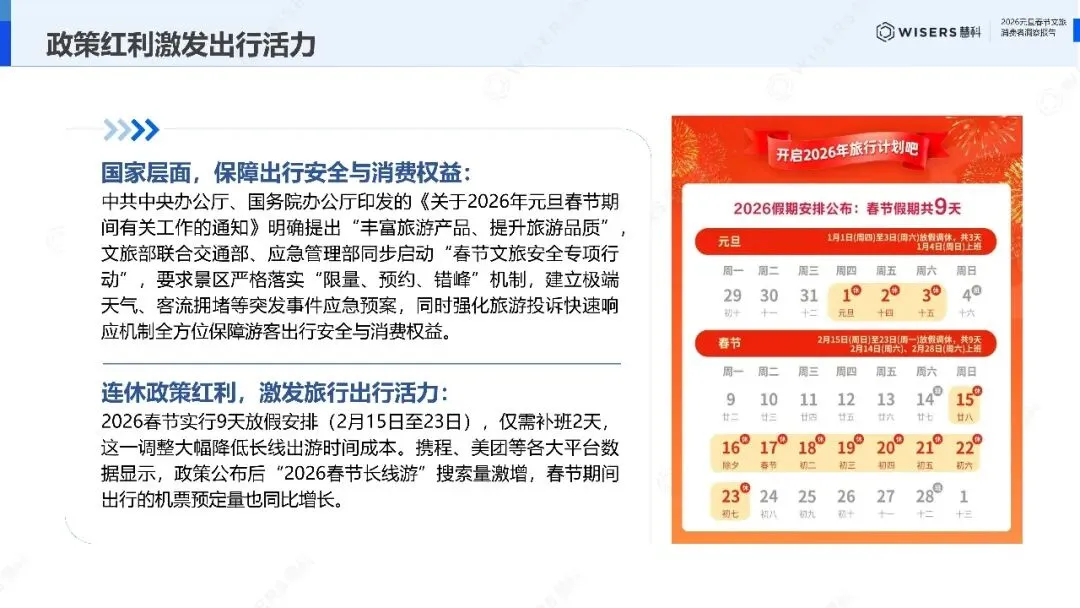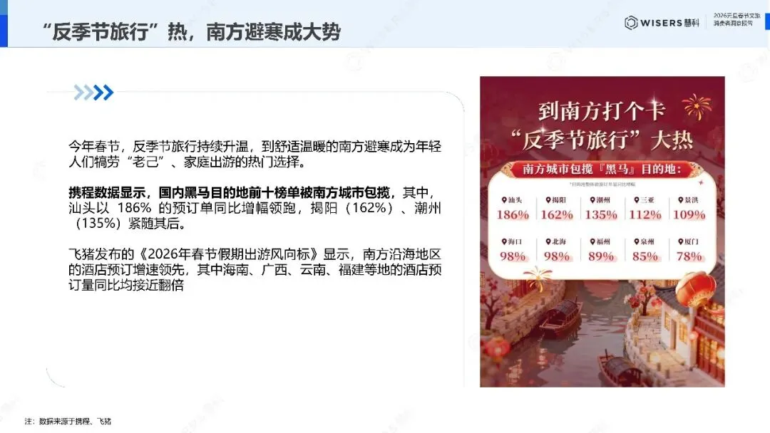 2026双节文旅呈现“冰雪+避寒”南北共振、亲子悦己三大主线:元旦5.4亿人出游,哈尔滨、三亚分列冷热极点,00后占39%带动“县城慢游”“Citywalk”搜索涨3倍;春节9天长假,80后“请5休15”占比48%,节中初三为错峰峰值,机票提前5天可省一成。政策端强化预约、投诉快反,冰雪大世界、海南免税等IP持续引流,南方汕头、潮州酒店预订翻倍,西北、东北机票增四成。