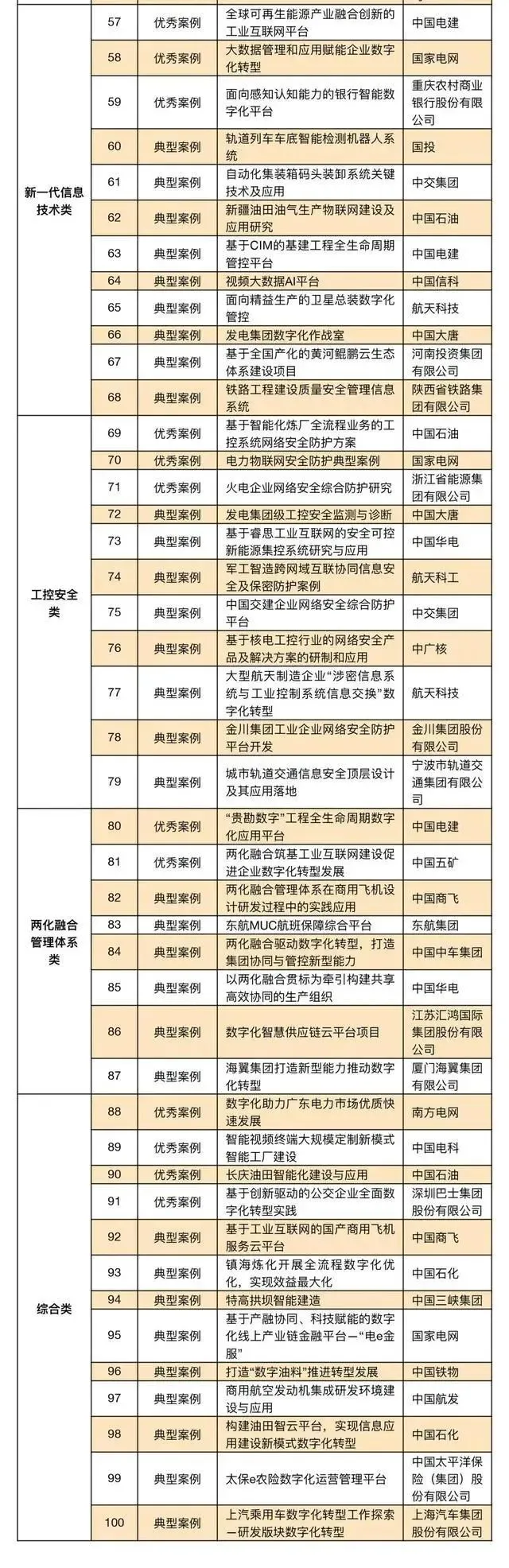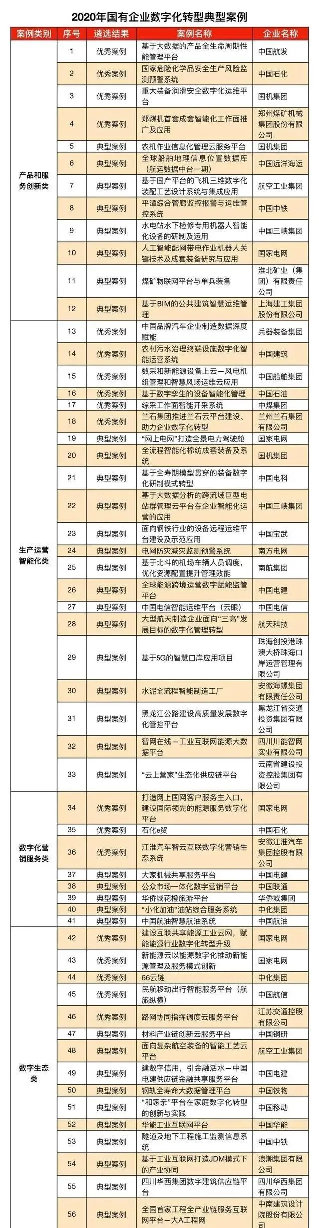尽管存在各种难题,仍然有不少国企抱着开放的态度敢于革新、勇于探索、勤于实践,让人敬佩、也同样值得研究。我们从国资委发布的《2020年国有企业数字化转型典型案例》中挑选出了61个国有企业数字化转型案例,这些案例的类型包括:产品和服务创新、生产运营智能化、数字化营销服务、数字生态、新一代信息技术、工控安全、两化融合管理体系和综合等8类。