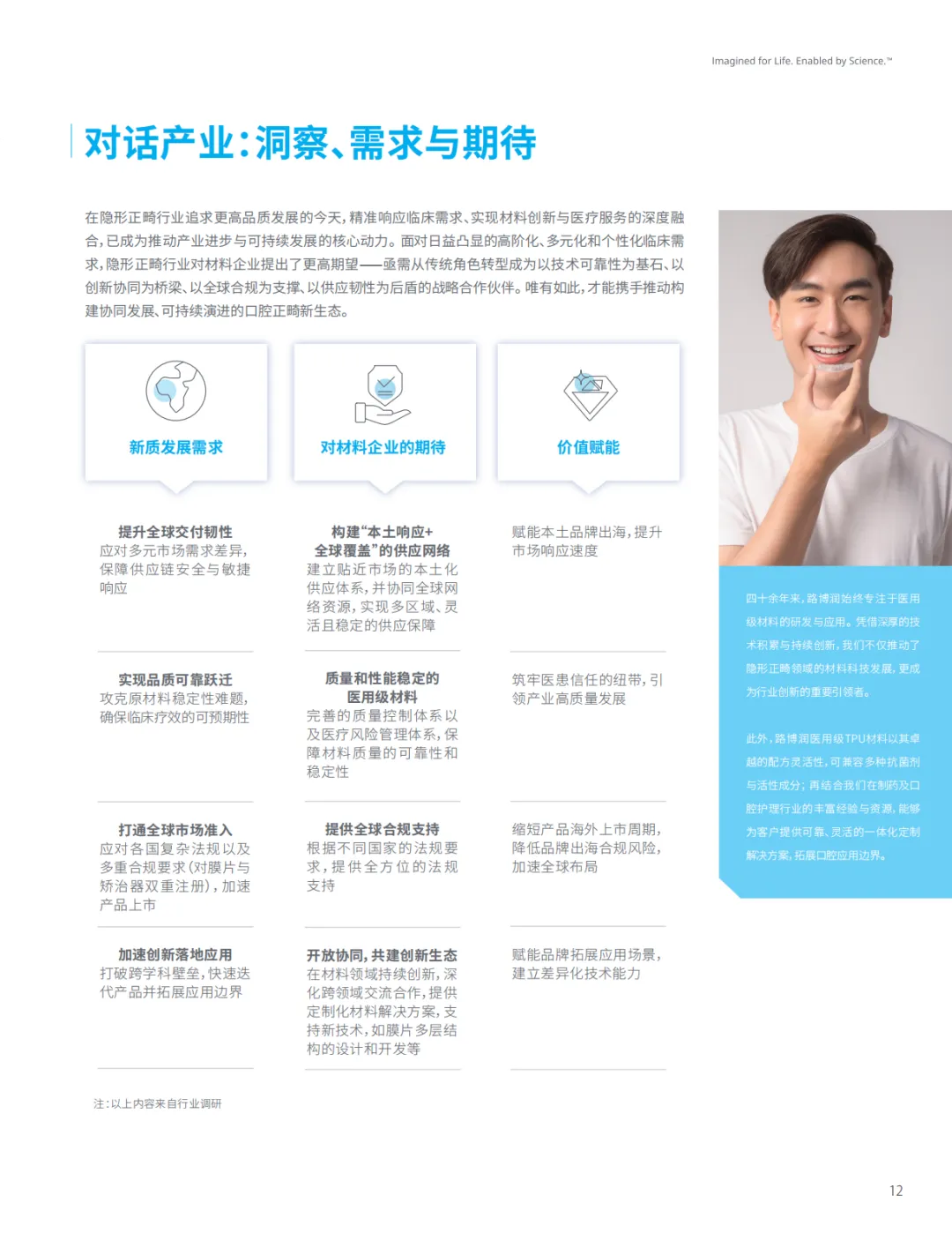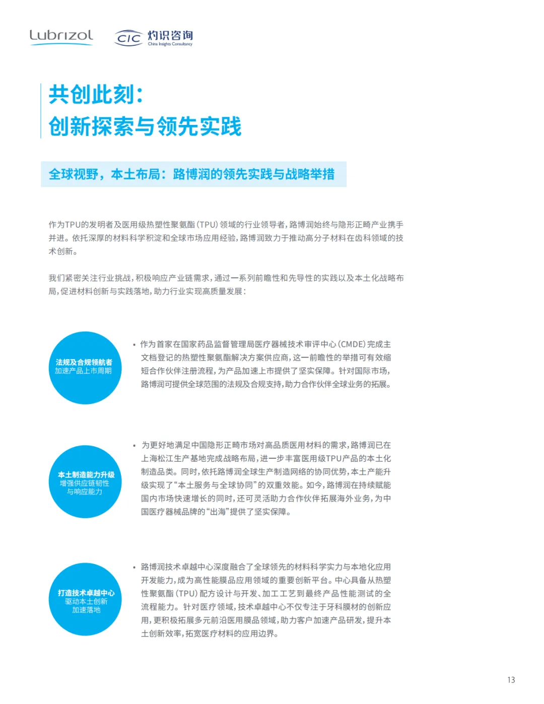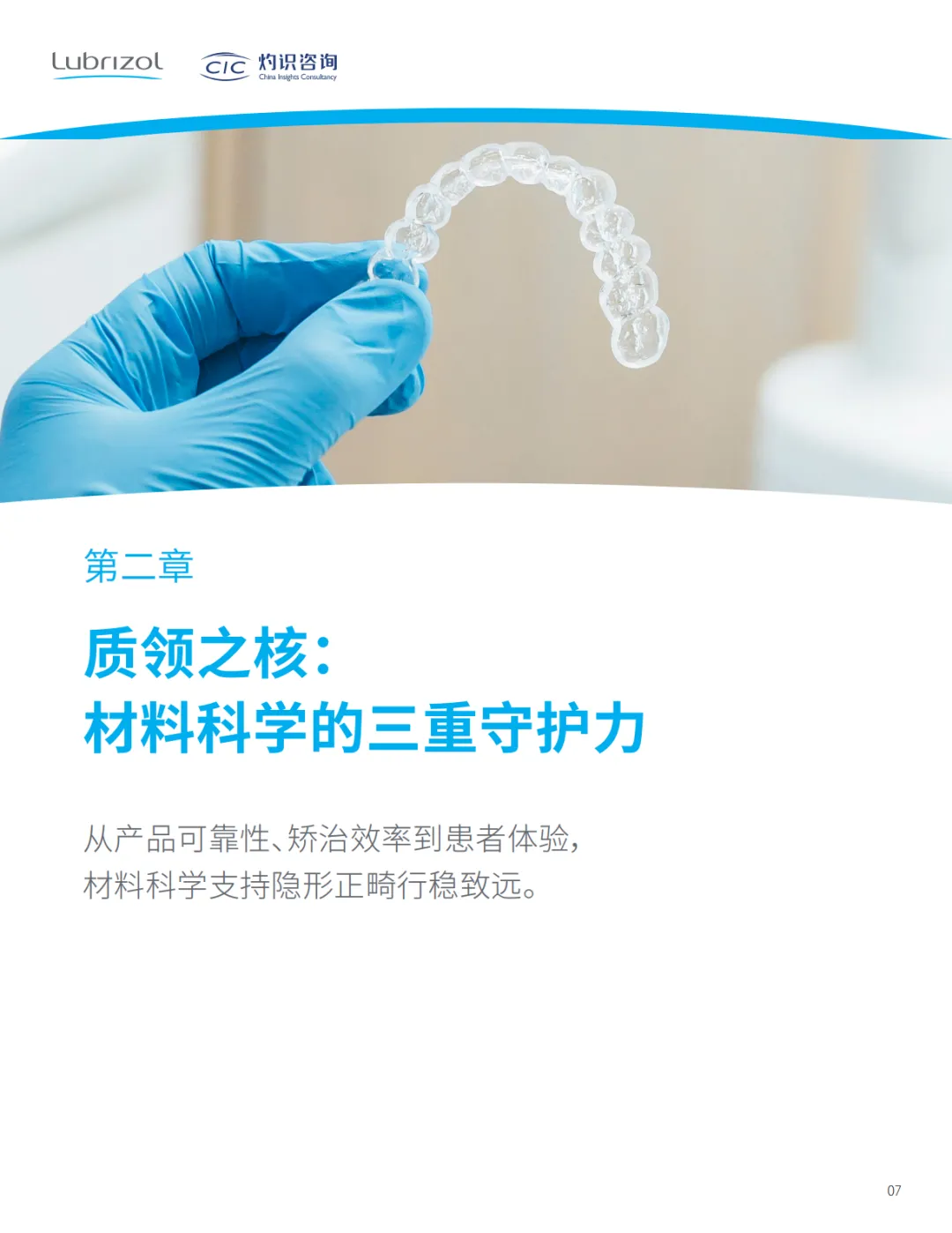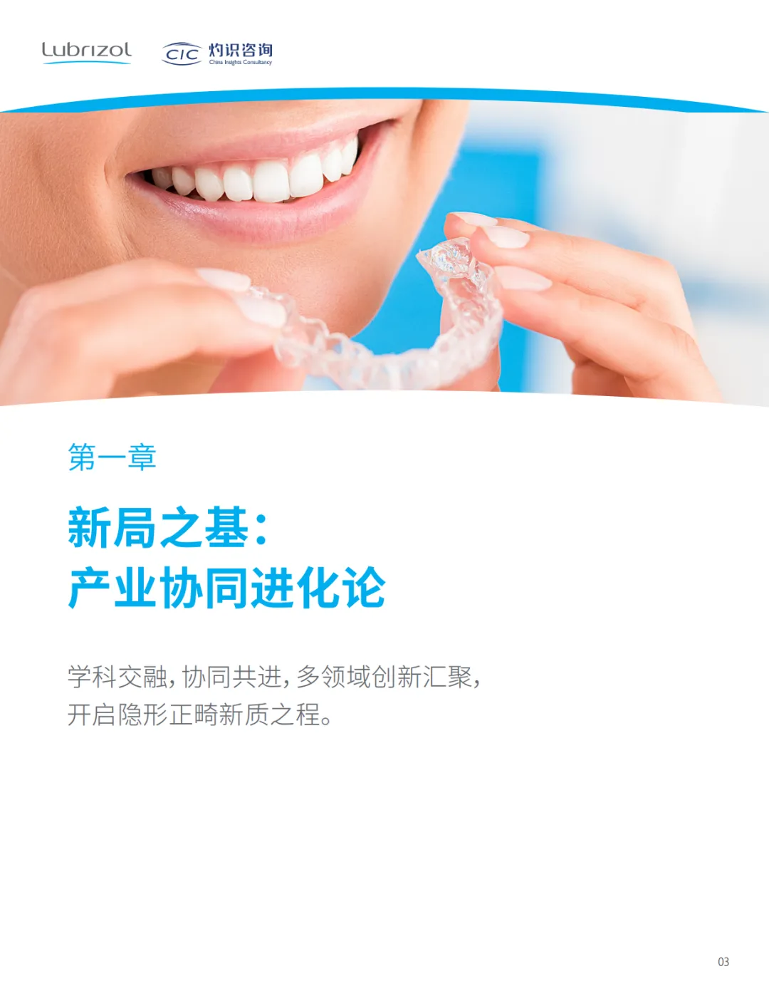 隐形正畸行业因多学科融合与产业链相对复杂而形成独特的发展格局。临床需求在产业链传递过程中,往往因专业壁垒与信息不畅而难以高效转化,成为创新进一步落地的障碍。基于“协同创造价值”的共识,路博润与灼识咨询携手,以材料创新与产业研究为双重视角,联合打造这本白皮书,聚焦“产业链协同与创新”,从材料科学切入,结合独立产业洞见,系统探讨材料创新在提升临床效果、拓展应用边界中的独特价值。亦呼吁产业链的协作,共同推动材料科学的持续创新,助力行业高质量发展。