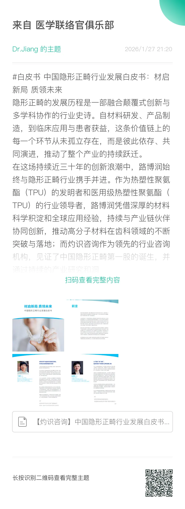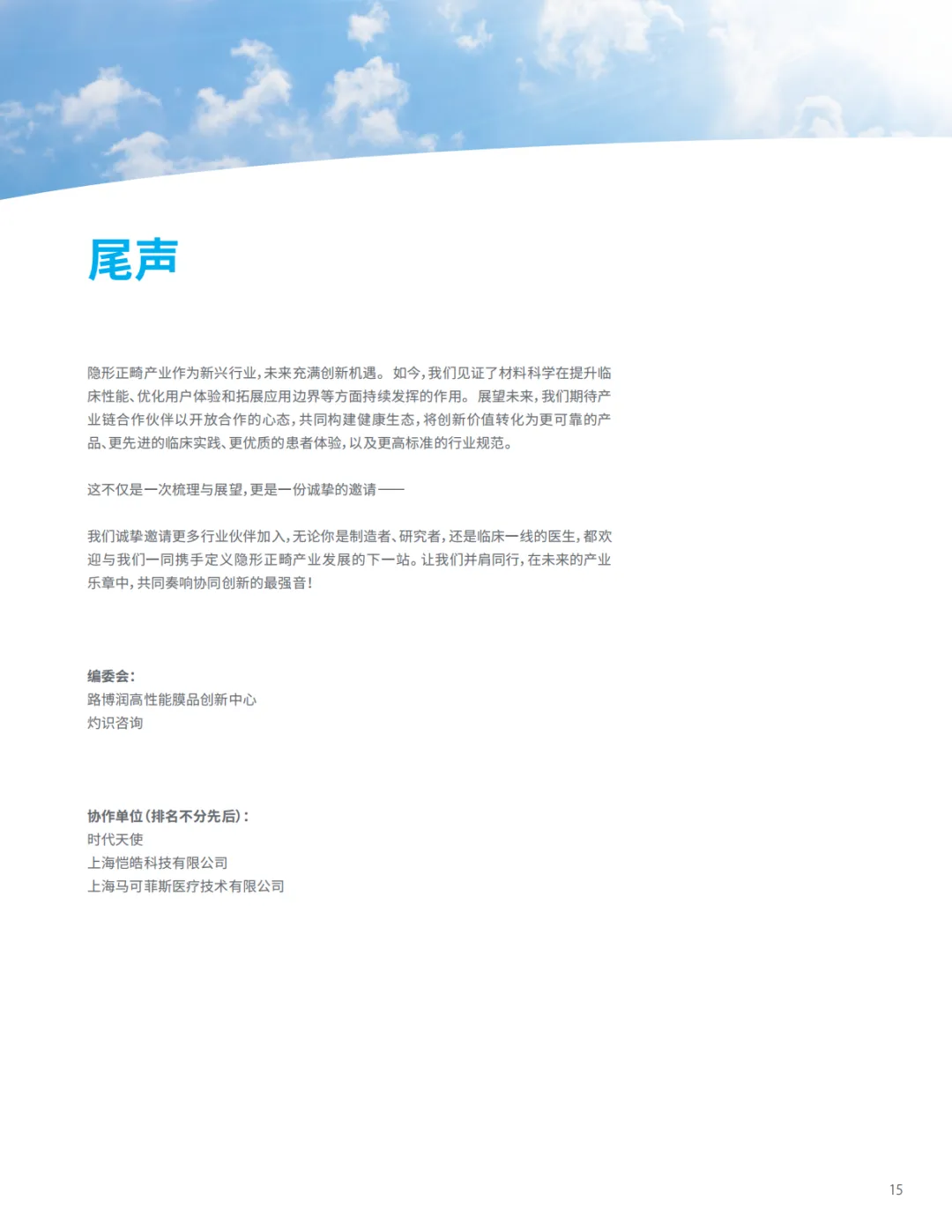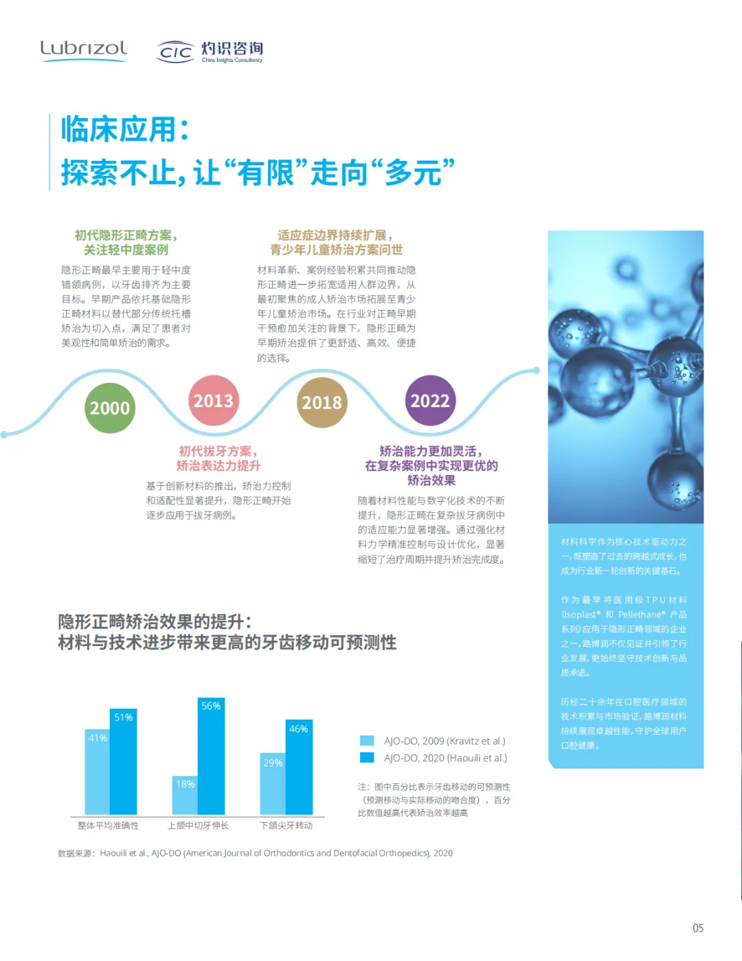 隐形正畸行业因多学科融合与产业链相对复杂而形成独特的发展格局。临床需求在产业链传递过程中,往往因专业壁垒与信息不畅而难以高效转化,成为创新进一步落地的障碍。基于“协同创造价值”的共识,路博润与灼识咨询携手,以材料创新与产业研究为双重视角,联合打造这本白皮书,聚焦“产业链协同与创新”,从材料科学切入,结合独立产业洞见,系统探讨材料创新在提升临床效果、拓展应用边界中的独特价值。亦呼吁产业链的协作,共同推动材料科学的持续创新,助力行业高质量发展。