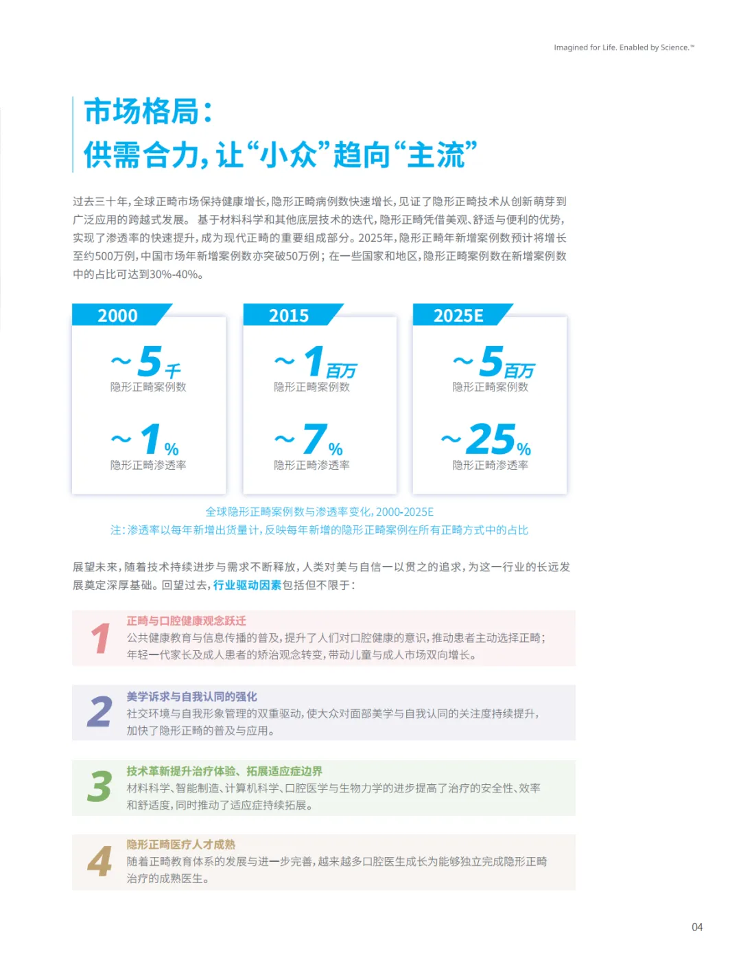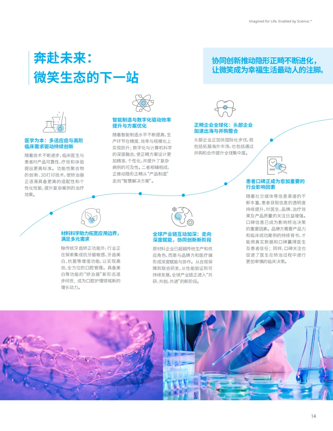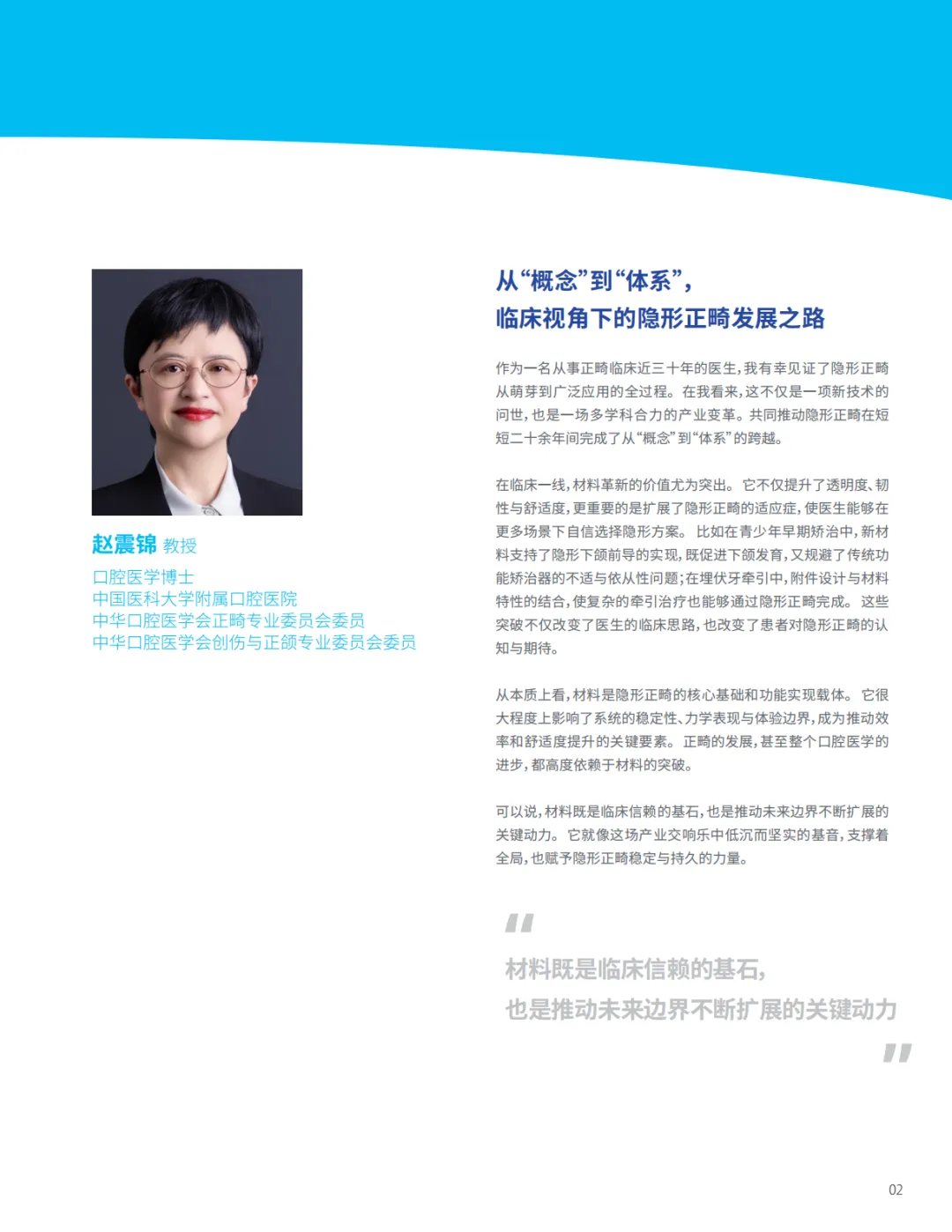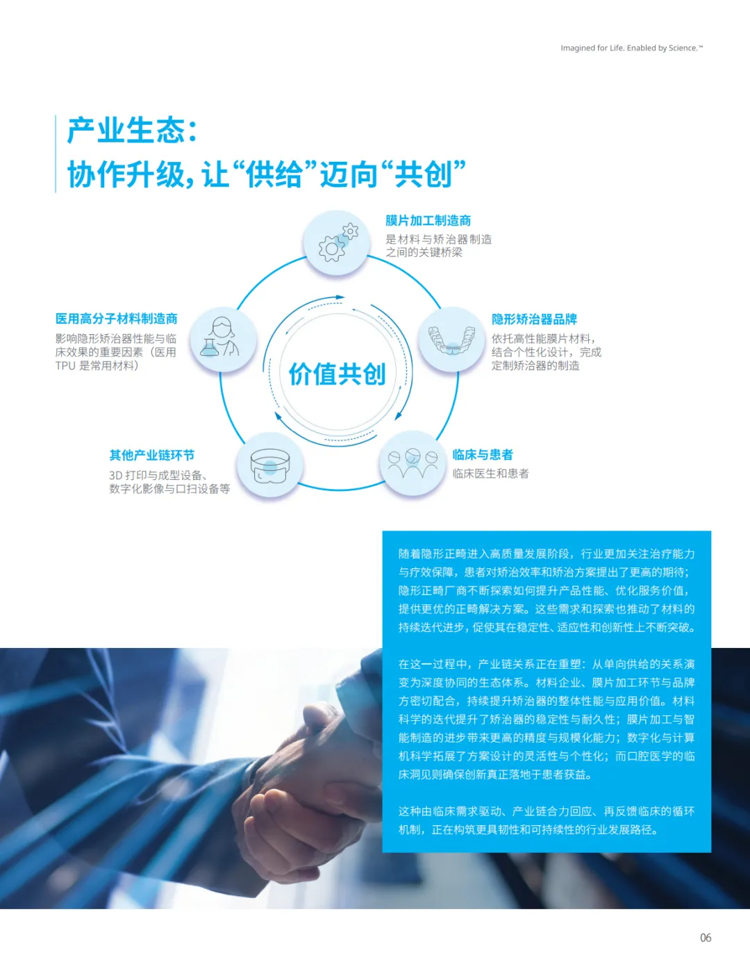 隐形正畸行业因多学科融合与产业链相对复杂而形成独特的发展格局。临床需求在产业链传递过程中,往往因专业壁垒与信息不畅而难以高效转化,成为创新进一步落地的障碍。基于“协同创造价值”的共识,路博润与灼识咨询携手,以材料创新与产业研究为双重视角,联合打造这本白皮书,聚焦“产业链协同与创新”,从材料科学切入,结合独立产业洞见,系统探讨材料创新在提升临床效果、拓展应用边界中的独特价值。亦呼吁产业链的协作,共同推动材料科学的持续创新,助力行业高质量发展。