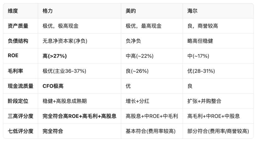 利润表:盈利能力强劲且稳定。毛利率受原材料价格和竞争影响有所波动,但龙头企业通过产品结构升级和费用控制,保持了较高的净利率水平(格力约15-17%,美的约10%,海尔约6-7%),且长期呈稳中有升趋势。ROE(净资产收益率)长期维持在较高水平(美的常年在20%以上)。