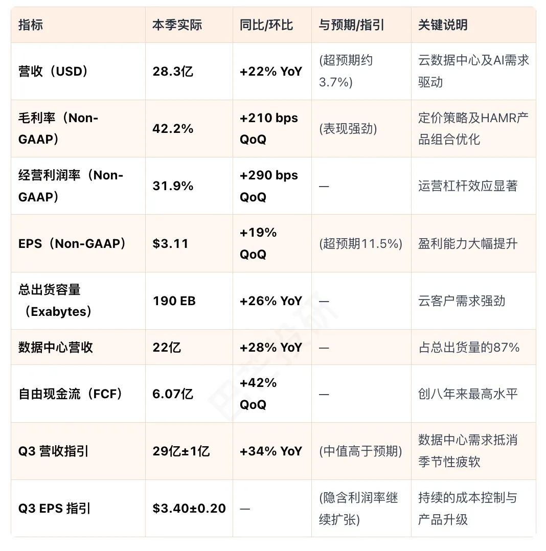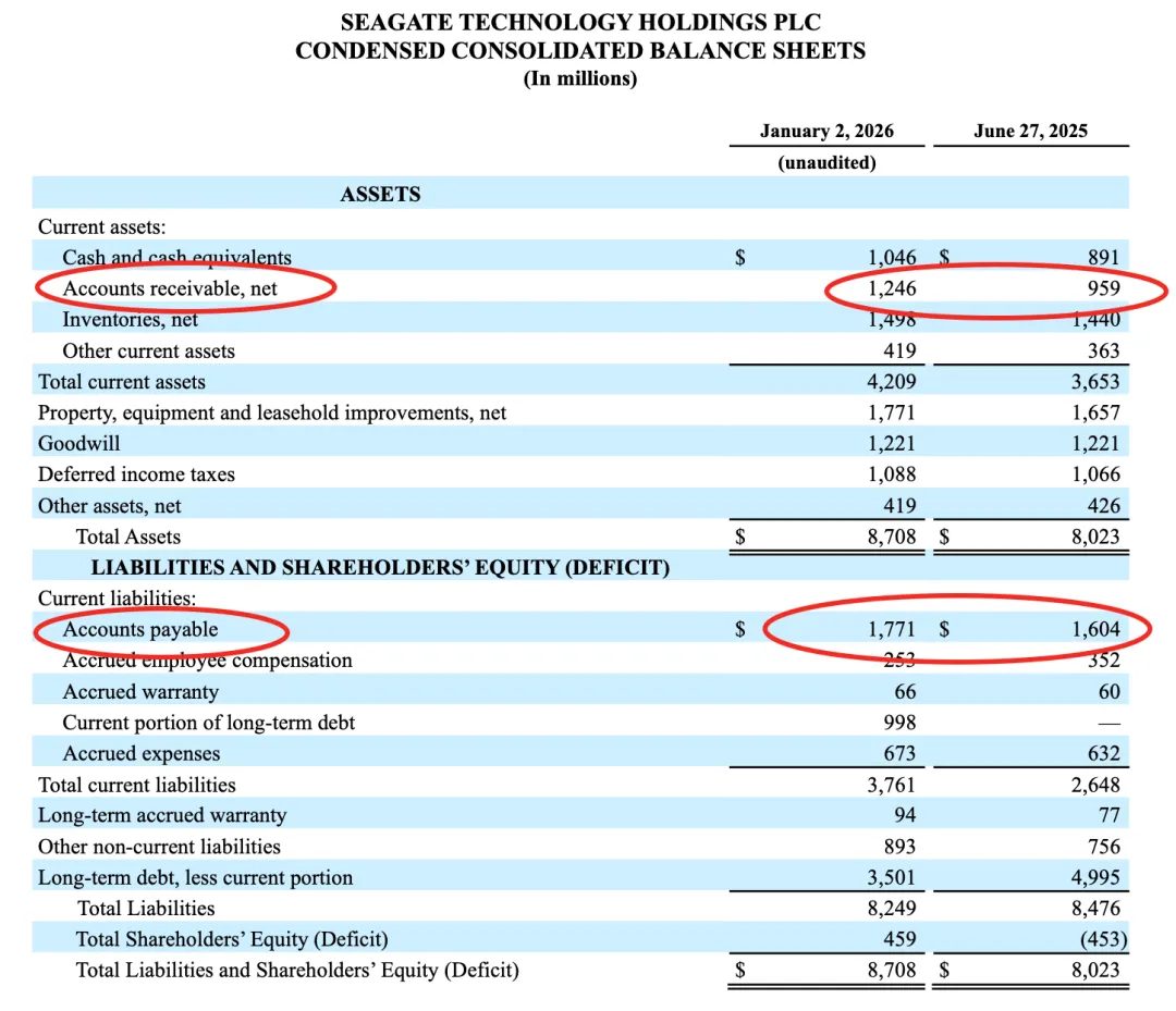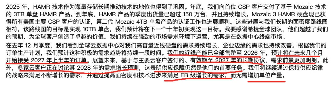 刚刚出炉的希捷的26Q2财报非常不错(后面还有闪迪和西部数据,这为他们也指明了方向),营收28.3亿美元,超预期。毛利率达到42%,自由现金流不断增加,创8年来最高水平,而且还偿还了5 亿美元将于2028年到期的可交换优先票据,并支付了1.54亿美元的现金股息。怎么说呢,收到的都是钱,说明非常的需求紧缺。再看2026年Q3的展望,营收为29亿美元,上下浮动1亿美元。其实我个人是觉得这个展望明显保守了。首先是应收和应付,这是最真实的。很明显应收从959到1246. 而应付从1604到1771,说明希捷对上游的把控力度在变强的同时,下游的客户非常缺货。存货从1440到1498,在应收明显增长的同时,存货非常的少,这说明销售量太快了。再看收入和成本,收入从2024年到2026年翻倍,而成本只增加了30%。成本控制非常好,而且公司毛利还在增加。说明东西变的更抢手。Earning Call上说的需求和供给更加明确。26年的已经卖完了,开始卖27,28年的。而且未来增长还是非常迅速。谈到定价,因为大家都关心价格上涨的问题。比如DRAM一直在涨价,但HDD似乎涨的不多。从下面的回答中也可以看出,涨价空间未来也不太大,但在4TB产品上,可能会涨价。希捷原话是:关于 HAMR 产品组合。由于工厂产能已基本饱和,我们不得不将单盘容量限制在 3TB,而且我们知道最终会推出 4TB 单盘产品。因此,我们一直在加大力度推进 4TB 单盘产品的研发和认证。随着时间的推移,我们将积极转向 4TB 单盘产品。希望这些信息对您理解产品组合有所帮助。另外,HAMR 产品组合必然是多种容量规格混合的。我认为目前市场对这些产品的需求主要集中在高容量规格上,而非低容量规格。