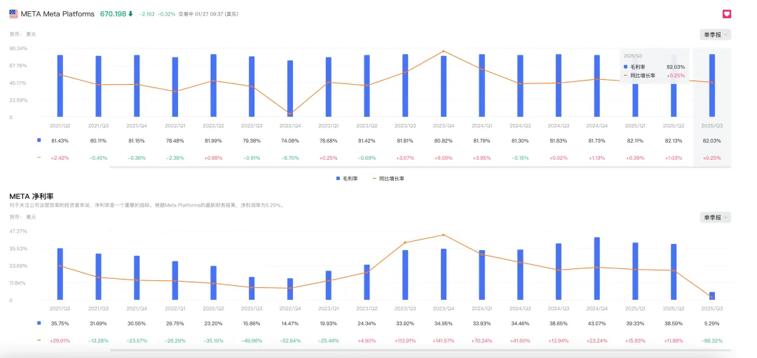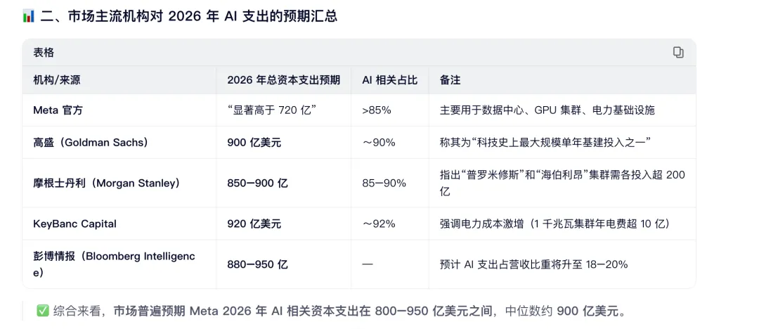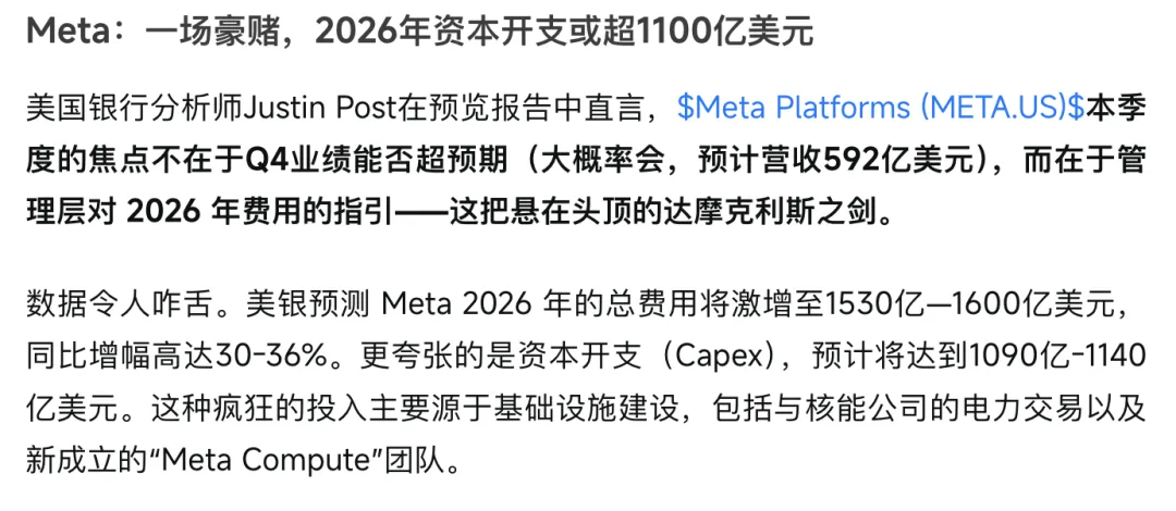 b、整理这次财报的看点:10 月财报,因上调 2025 年 CapEx 至 720 亿美元,并预告 2026 年“显著更高” 公司宣布通过债券融筹集250亿融资,可能引发市场对其财务情况和未来发展资金需求的顾虑 由于一次性非现金计提税费160亿导致营收和利润不如市场预期。实际上我觉得这个并不影响。 对高额的投入能否转化为营收的担忧。 高投入的情况下,Meta的大模型一直很拉胯。