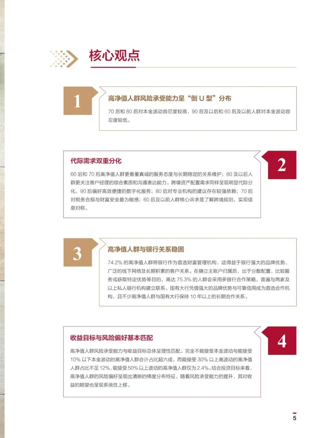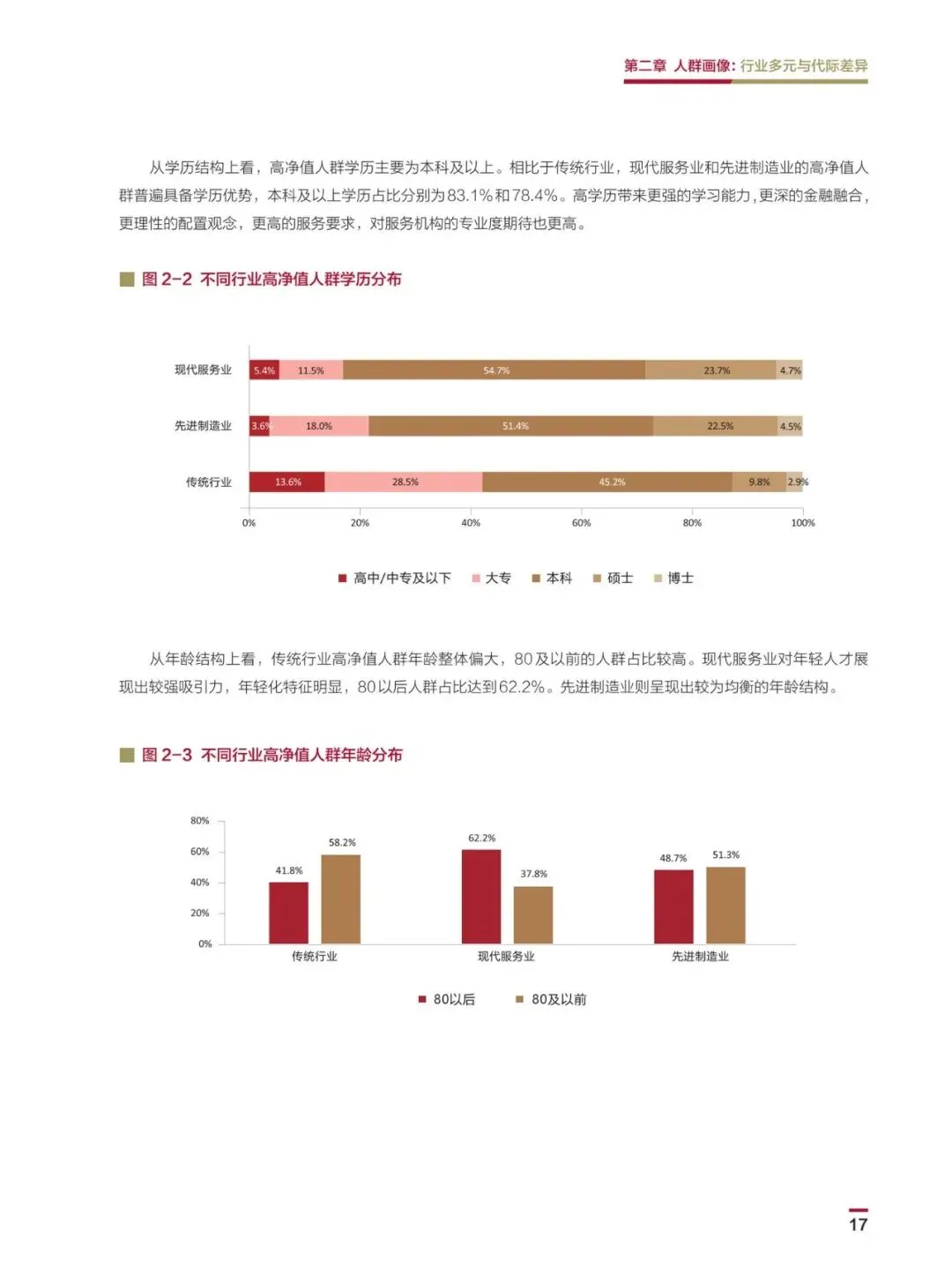 高净值人群的构成正从单一的传统实业家,向传统行业、现代服务业与先进制造业并存的复合型格局演进。传统行业仍是高净值人群最主要的来源,但现代服务业与先进制造业人群占比可观,且普遍具备学历优势,对服务机构的专业度期待更高。代际需求呈现明显分化:60后和70后更看重真诚的服务态度与长期稳定的关系维护;80后及以后人群则更关注客户经理的综合素质和沟通效能;90后追求高效便捷的数字化服务。