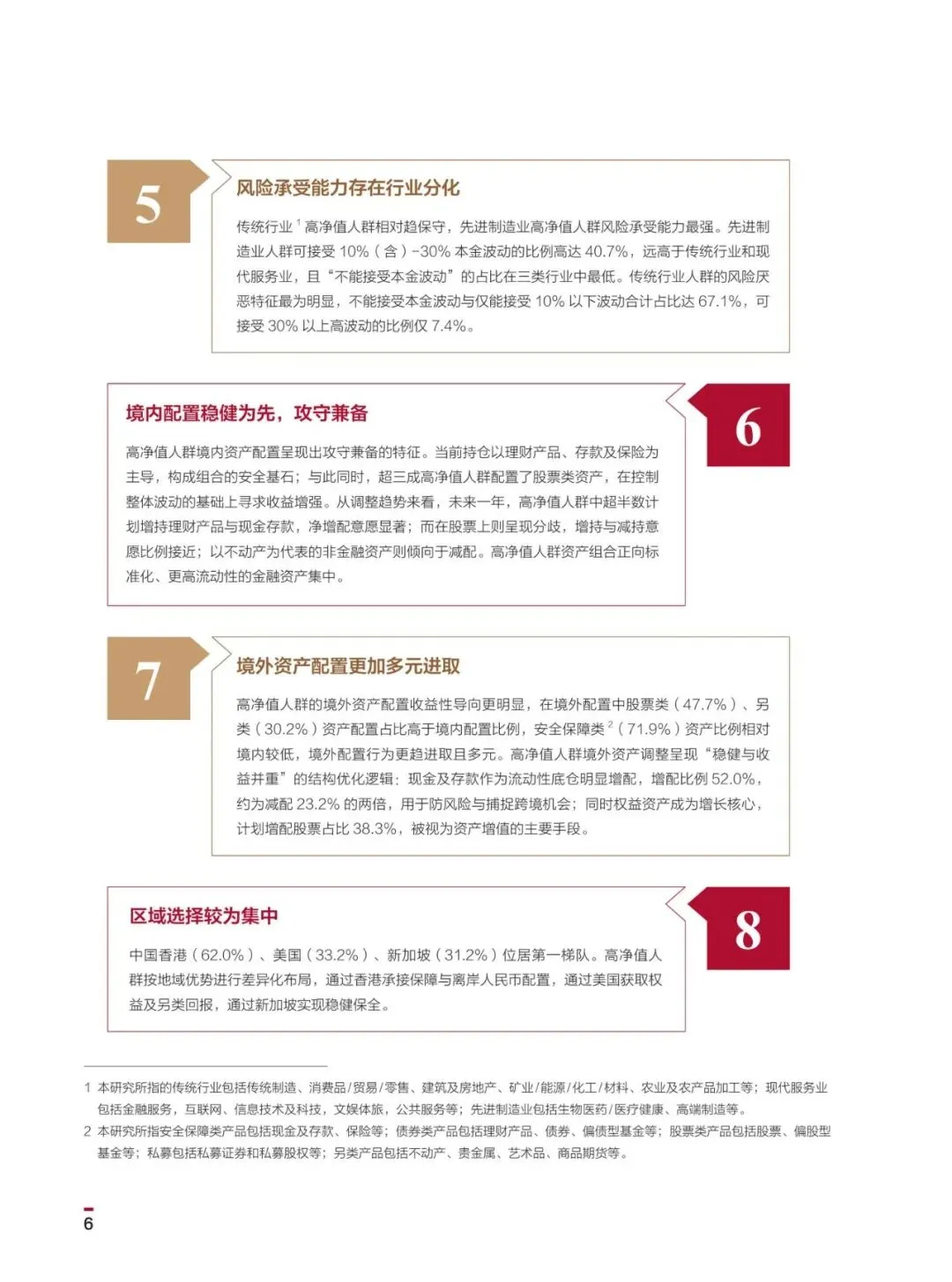在资产配置方面,高净值人群整体风险偏好理性,收益目标与风险承受能力基本匹配,超六成人群仅能接受10%以下的本金波动。境内配置以稳健为先,当前持仓以理财产品、存款及保险为主导,构成安全基石;同时超三成人群配置了股票类资产,寻求收益增强,呈现出攻守兼备的特征。境外配置则更加多元进取,收益性导向更明显,股票类、另类资产配置占比显著高于境内。中国香港、美国、新加坡是高净值人群境外配置的首选地,他们倾向于按地域优势进行差异化布局。