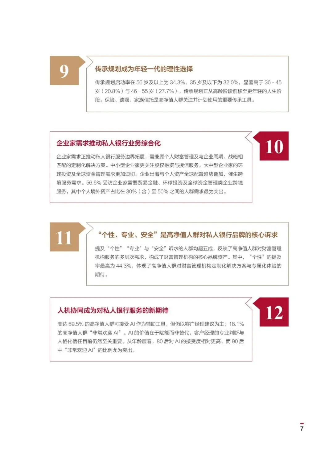 高净值人群对私人银行服务的需求已超越单纯的资产配置,正向综合化、定制化方向升级。个性、专业与安全构成其对私人银行品牌的核心诉求。医疗健康、子女教育与法税服务已成为三大核心非金融“新刚需”。传承规划意识显著升温,正从高龄阶段前移至更年轻的人生阶段,保险、遗嘱、家族信托是备受关注的传承工具。企业家需求则推动私人银行服务边界不断拓展,需兼顾个人财富管理及与企业周期相匹配的定制化解决方案,企业出海与个人资产全球化趋势叠加,催生了旺盛的跨境服务需求。