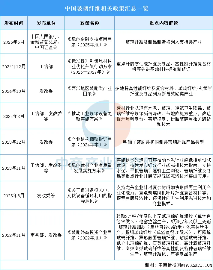 国家陆续出台了多项政策,鼓励玻璃纤维行业发展与创新,《标准提升引领原材料工业优化升级行动方案(2025—2027年)》《西部地区鼓励类产业目录》《推动工业领域设备更新实施方案》等产业政策为玻璃纤维行业的发展提供了明确、广阔的市场前景,为企业提供了良好的生产经营环境。具体情况列示如下: