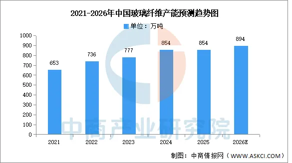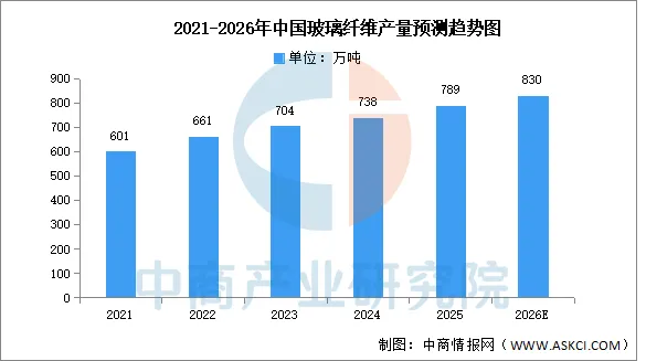 中商产业研究院发布的《2025-2030年中国玻璃纤维行业前景与市场趋势洞察专题研究报告》显示,2024年中国玻纤企业产量为738万吨,增速较上年有所下降,2025年产量约达789万吨。中商产业研究院分析师预测,2026年中国玻璃纤维产量有望超过800万吨。