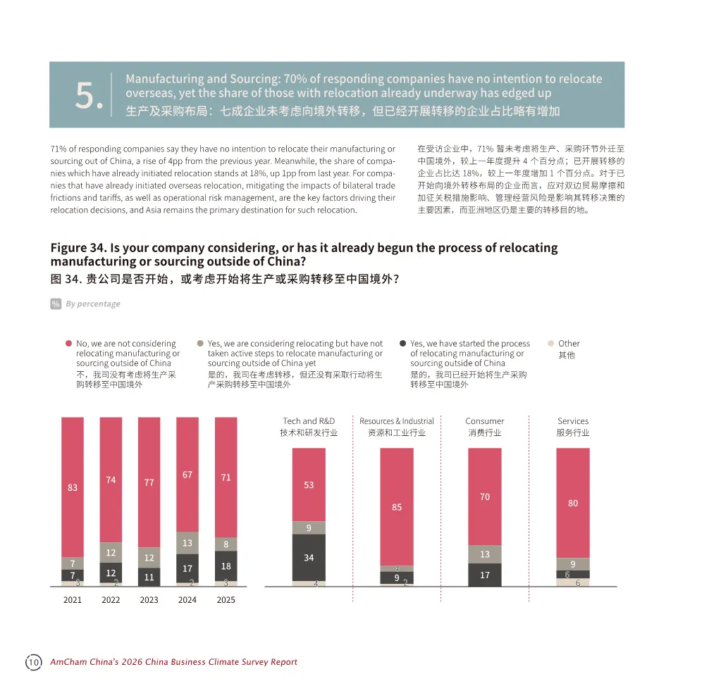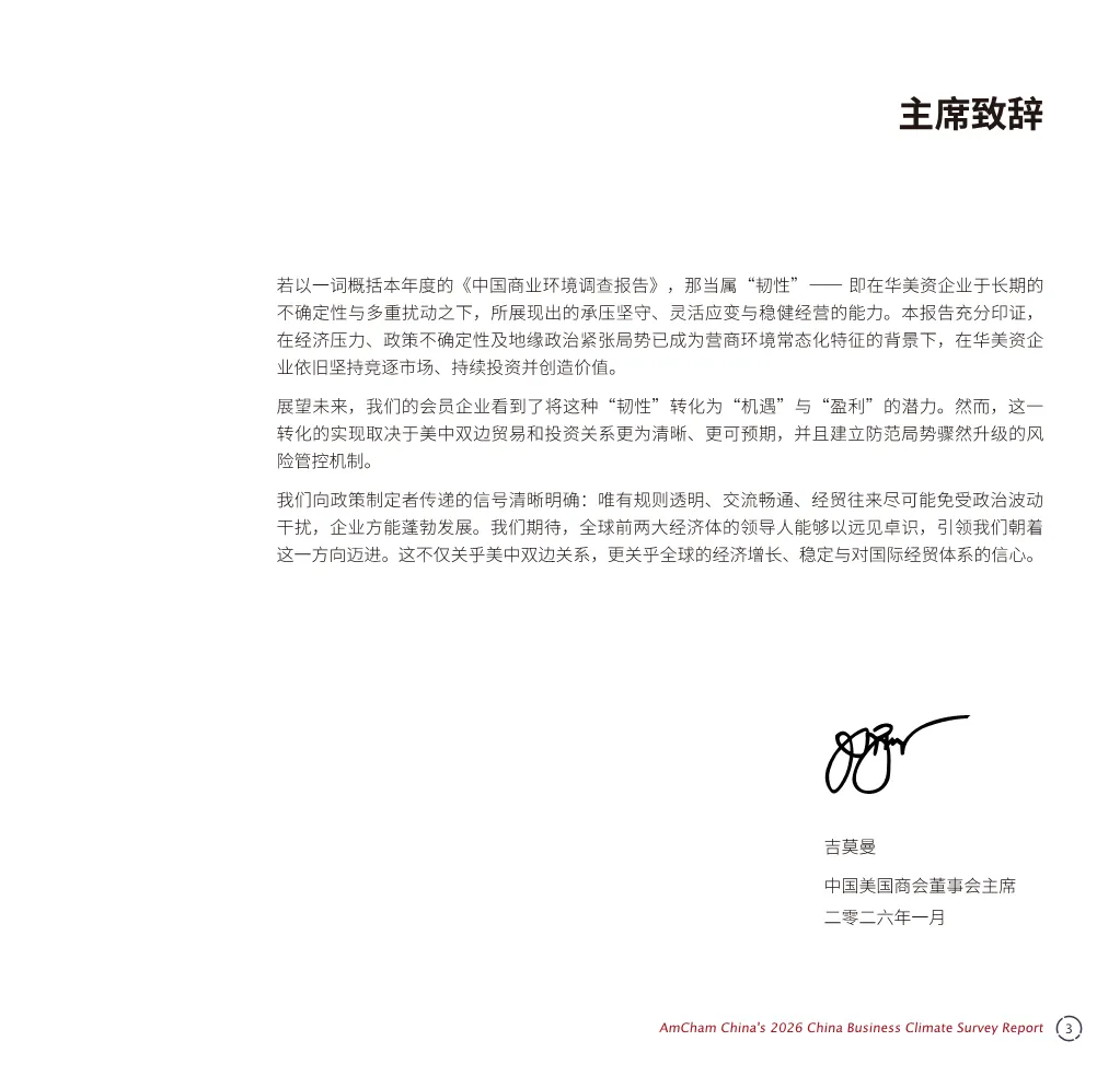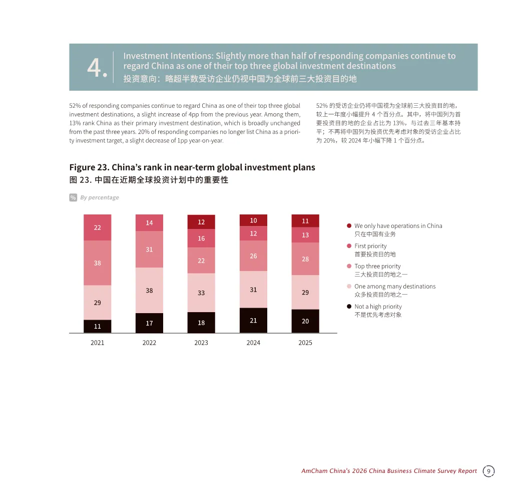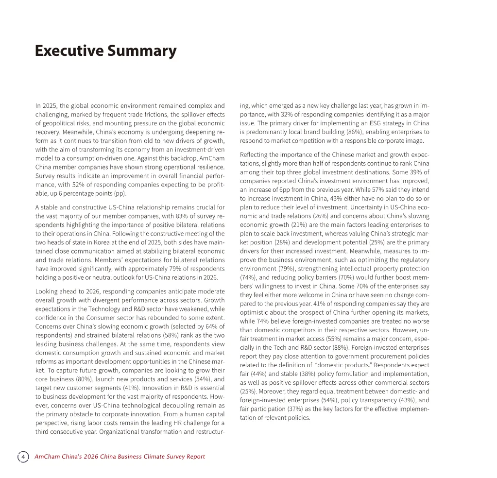 2025年,尽管全球经济复杂多变、地缘政治风险外溢,在华美资企业展现出强大经营韧性。52%的受访企业预计实现盈利,较2024年提升6个百分点,其中服务业表现尤为突出,盈利预期企业占比达61%,同比大幅增长15个百分点。这一"韧性"特质体现在企业持续竞逐市场、保持投资并创造价值的整体能力上。投资目的地地位稳固:52%的企业仍将中国列为全球前三大投资目的地,占比提升4个百分点。13%的企业视中国为首要投资目的地,与往年基本持平。投资环境感知改善:39%的企业认为中国投资环境有所改善,同比上升6个百分点,连续三年呈上升趋势。认为投资环境恶化的企业比例降至23%,同比下降5个百分点。投资分化趋势明显:57%的企业计划增加投资,其中18%预计增幅超20%。但43%的企业暂无扩大投资计划或拟减少投资,反映企业在华布局呈现"增强核心"与"风险规避"并存的双重策略。投资驱动因素:28%的企业将中国市场的战略重要性列为扩大投资首要动因,25%基于对中国市场增长潜力的看好。政策激励和人才储备也是重要考量因素。挑战格局重大转变:64%的企业将"中国经济增速放缓"列为2026年首要商业挑战,这是该选项首次登顶。尽管58%的企业仍将美中关系紧张视为主要挑战,但 intensity 显著下降,持悲观态度的企业比例从65%降至52%。新兴挑战浮现:行业产能过剩首次进入前五大挑战,30%的企业表示关注。这在资源和工业行业尤为突出,54%的企业认为产能过剩构成重大挑战。科技与研发行业对美中关系的担忧超过经济放缓,63%将其列为首要挑战。持续存在的障碍:来自本土企业的竞争压力(31%)、法律法规执行不一致(26%)仍是长期困扰。技术与研发行业在市场准入方面感受最深,88%认为存在不公平待遇。产能转移意愿保持低位:71%的企业明确表示不考虑将生产或采购迁出中国,该比例提升4个百分点。已开始转移的企业占18%,主要动因是双边贸易摩擦、风险管理和关税规避。亚洲仍是首选目的地,38%计划迁至发展中亚洲国家。本土化战略深化:21%的企业选择深化在华产品和服务本地化以应对贸易摩擦,19%计划在中国市场采购或组装更多零部件。关税影响呈现慢性化:受美国关税影响的企业中,47%表示盈利能力下降但仍可维持运营,43%面临进口成本上升。相比2025年5月,关税冲击从"急性冲击"转为"慢性挤压",企业适应力提升但利润空间持续承压。人力成本挑战持续:整体人力成本增加连续第三年成为首要人力资源挑战,45%的企业表示关切。但预期成本上升的企业比例连续三年回落,服务业有45%的企业预计人力成本将持平或下降。组织转型压力凸显:32%的企业将组织转型与重组列为主要挑战,反映企业积极调整架构以应对市场变化。人才战略保持稳定:77%的企业计划维持或扩大在华员工规模,其中25%预计增员。但技术与研发行业减员预期较高,约三成企业预计缩减人员,9%预测减员幅度超10%。人才招聘焦点转移:46%的企业将"寻找合适人才"列为人力资源首要任务,同比上升14个百分点,超过"员工职业发展"(48%)。地缘政治(41%)和经济放缓(32%)是外籍人才招聘与留任的两大障碍。管理层构成变化:非中国大陆籍高管比例下降,超25%非大陆籍高管的企业占比减少4个百分点。女性高管比例也出现下滑,女性高管低于25%的企业比例增加4个百分点,服务业降幅达15个百分点。ESG实施普及:87%的企业已在华实施ESG战略,服务行业实施比例最高达92%。驱动力深刻转变:86%的企业实施ESG首要动机是"在中国市场树立负责任商业品牌",较上年显著提升。总部要求的驱动作用下降4个百分点至44%,显示ESG正从"外部合规"转向"内生需求"。社会贡献跃居首位:社会贡献超越多元包容成为ESG首要关注领域,55%的企业将其列为优先事项。实施面临三大障碍:客户或公众意识不足(38%)、缺乏行业标准(34%)、政府支持不足(26%)是主要挑战。风险感知相对乐观:73%的企业认为在华知识产权和数据安全风险与全球其他地区持平或更低,认为风险更低的比例提升4个百分点至11%。执法改善获认可:37%的企业表示中国知识产权执法工作在过去一年有所改善,同比上升5个百分点。核心挑战未变:29%的企业认为"法律手段维权困难"是最重大挑战,25%认为"法律法规保护不足",后者占比上升6个百分点。技术分享意愿回升:11%的企业愿意与中国商业伙伴分享更多技术专利知识,技术与研发行业不愿分享的比例下降9个百分点。67%的企业分享技术主要出于商业利益自愿决策。关系重要性不变:83%的企业强调积极的美中关系对在华业务至关重要,技术与研发行业关注度高达86%。预期显著改善:79%的企业对2026年美中关系持积极或中性态度,同比提升30个百分点,为近年来最显著改善。贸易谈判期待前五项:59%的企业最希望看到进一步降低关税;50%期待扩大外资市场准入;26%希望加强知识产权保护;19%期望缩小出口管制范围;17%关注数据跨境传输政策改善。对美政府期待:37%的企业希望美方避免激烈言辞和行动;36%期待降低对华关税;33%希望建立常态化、结果导向的高层沟通机制。对中政府期待:24%希望确保公平竞争环境;21%期待降低美商品关税并扩大关税豁免;21%希望与外国商界加强交流。企业期待政策制定与执行更加公平透明,将"内外资企业同等待遇"(54%)、"政策透明度"(43%)和"公平参与机会"(37%)视为政策有效落地的关键。70%的企业认为改善监管环境、加强知识产权保护