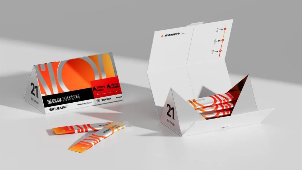 针对年轻女性体态管理赛道的红海竞争现状,诺特兰德S100黑咖啡旨在打破市面同质化的“方盒”视觉惯性,精准传递“稳固支撑、锐意向上”的体态管理隐喻;摒弃传统盒型,启用极具辨识度的三角形结构,一体成盒、减少人工时间成本,同时采用多层卡纸结构,在运输过程中减少暴力挤压问题;视觉语言致敬蒙德里安的几何美学,利用线条与色块的黄金分割构建“动态平衡”;色彩策略深度捆绑“体态管理”概念,以高饱和度的活力色调碰撞金属哑银质感,兼具科学专业背书与时尚潮流张力。