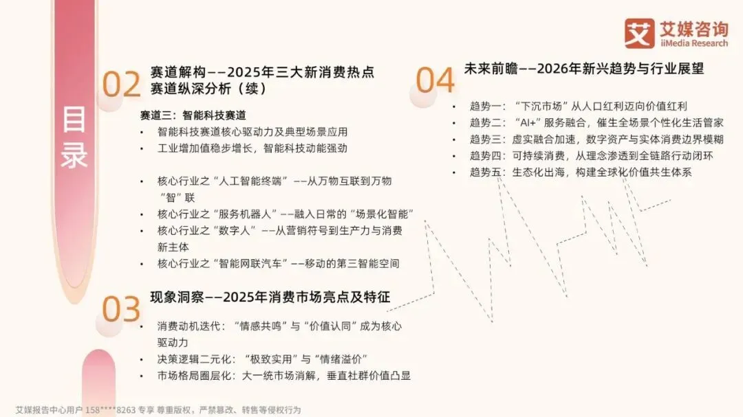 报告最后展望了2026年的新兴趋势。主要包括:“下沉市场”从依赖人口红利转向挖掘价值红利;“AI+”服务融合催生全场景个性化生活管家;虚实融合加速,数字资产与实体消费边界模糊;可持续消费从理念渗透转向全链路行动闭环;以及生态化出海,构建全球化价值共生体系。这些趋势预示着中国新消费生态将持续进化,为企业和投资者指明未来方向。
