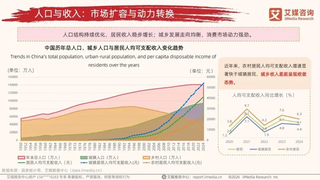 《2026年中国新消费趋势白皮书》由艾媒咨询及其旗下艾媒新消费产业研究院联合发布。这份报告深入剖析了中国消费市场正在经历的结构性变革,系统性地描绘了从宏观基础到微观赛道的全景图景。报告指出,中国消费市场正从过去的“规模扩张”阶段,全面转向“结构适配”的新周期,消费升级与产业升级的良性互动成为核心驱动力。