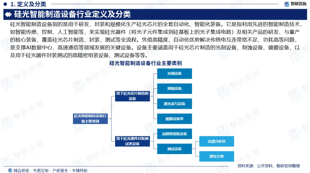 行业定义及分类:硅光智能制造设备指的是用于研发、封装和规模化生产硅光芯片的全套自动化、智能化装备。凭借高精度、自动化优势解决传统电互连带宽不足、功耗高等问题,是支撑AI数据中心、高速通信等领域发展的关键设备。设备主要涵盖用于硅光芯片制造的光刻设备、刻蚀设备、镀膜设备,以及用于硅光器件封装测试的高精密组装设备、测试设备等等。