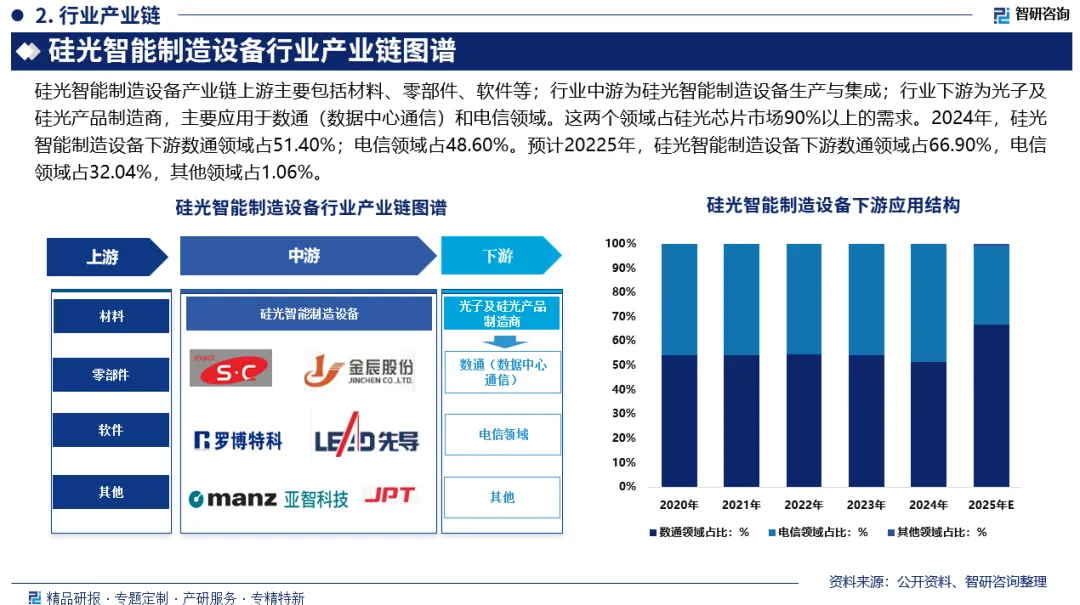 细分市场格局:硅光智能制造设备的下游应用主要集中在数通(数据中心通信)和电信领域,这两个领域占硅光芯片市场90%以上的需求。2024年,硅光智能制造设备应用于数通领域占51.40%;电信领域占48.60%。预计20225年,硅光智能制造设备应用于数通领域占66.90%,电信领域占32.04%,其他领域占1.06%。