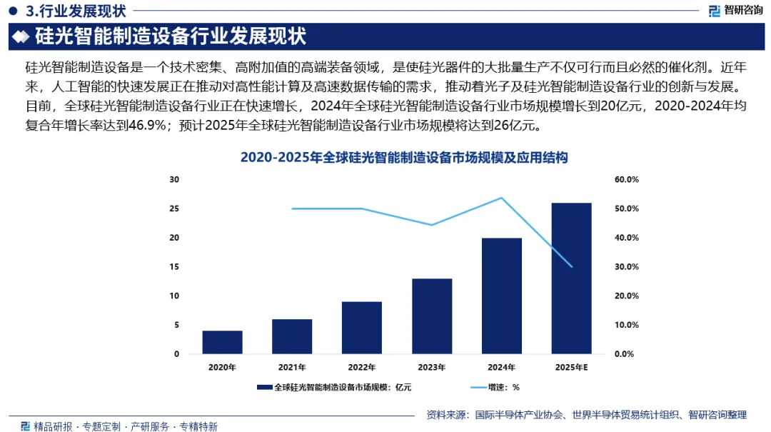 市场规模:近年来,人工智能的快速发展正在推动对高性能计算及高速数据传输的需求,推动着光子及硅光智能制造设备行业的创新与发展。目前,全球硅光智能制造设备行业正在快速增长,2024年全球硅光智能制造设备行业市场规模增长到20亿元,2020-2024年均复合年增长率达到46.9%;预计2025年全球硅光智能制造设备行业市场规模将达到26亿元。