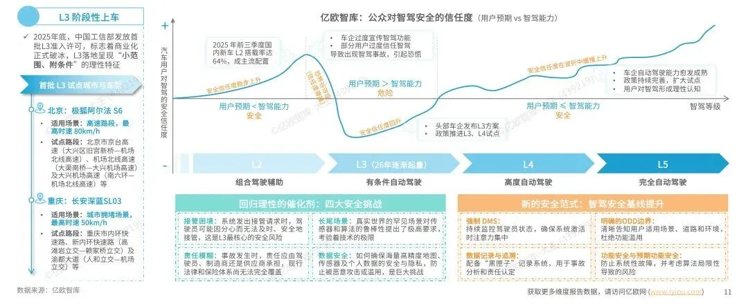 2025年底中国工信部首批L3准入许可的发放,标志着智驾L3进入"小范围、附条件"的商业化阶段,而安全基线的提升正推动2026年智驾行业回归理性:一方面,接管困境、责任模糊等四大安全挑战倒逼行业正视技术边界;另一方面,强化DMS监控、明确 ODD场景等新安全范式,用户对智驾的理性认知,让行业从过度宣传、盲目信任转向以安全为核心的稳健发展。