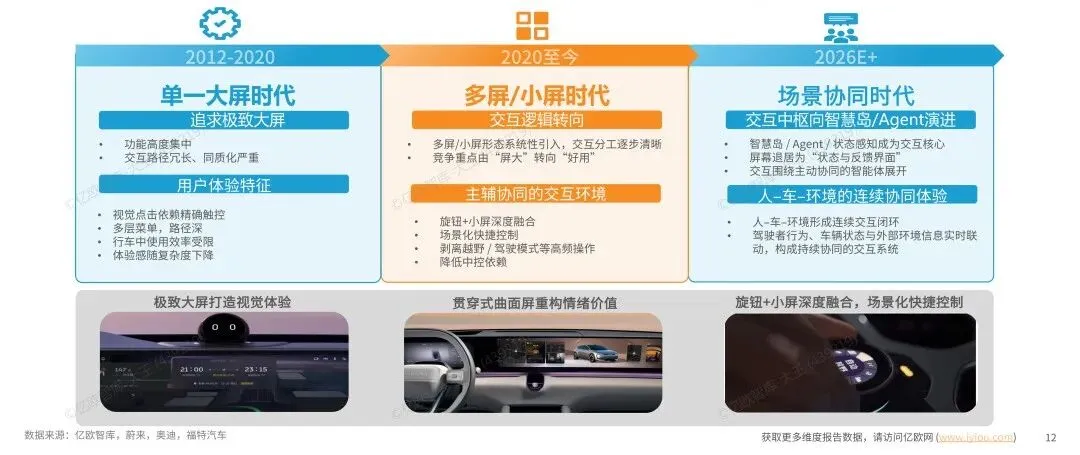 在中控大屏高度同质化的背景下,场景化小屏幕正在崛起,智能座舱的交互形态正在经历系统性重构。交互设计重心由"功能堆叠"转向"场景触发与协同效率",交互逻辑正从以中控大屏为入口的集中式交互,转向以场景为中心的多屏/小屏控制。小屏通过承接驾驶模式、空调控制等高频操作,有效降低驾驶过程中的视觉与认知负荷,正成为打造差异化体验与构建高频交互闭环的新入口。
