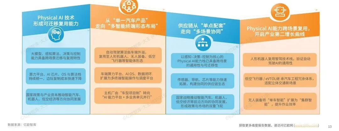 随着以智能驾驶为代表的PhysicalAI技术在智能驾驶场景中完成工程化验证,其感知、决策与控制能力正具备跨场景迁移与复用特性,并向人形机器人、低空飞行器等多形态智能终端外溢。在此背景下,部分主机厂正从传统的整车技术集成者,拓展为具有统一的技术底座的跨终端PhysicalAI能力平台,推动AI能力在多终端间共享与协同演进。