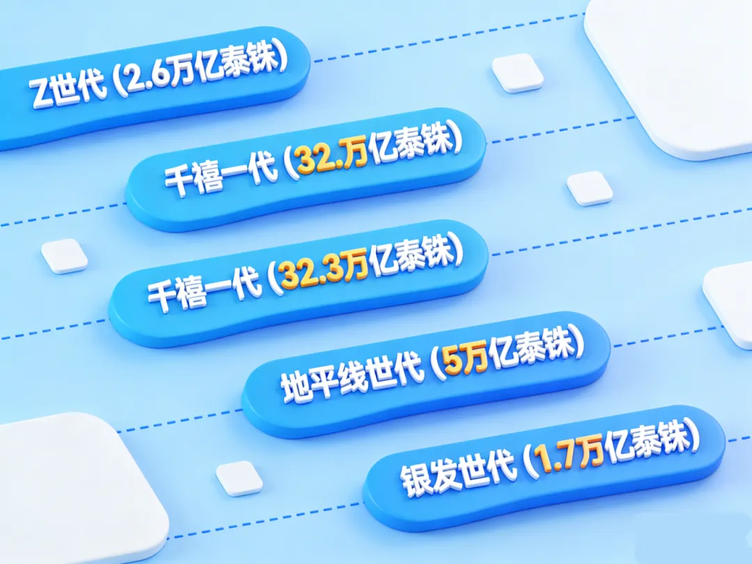 Z世代(13~28岁):年消费总额超过2.6万亿泰铢,他们更注重社交娱乐与自我表达,是潮流趋势的引领者。偏好美妆个护、潮流时尚、电子配件、网红食品。