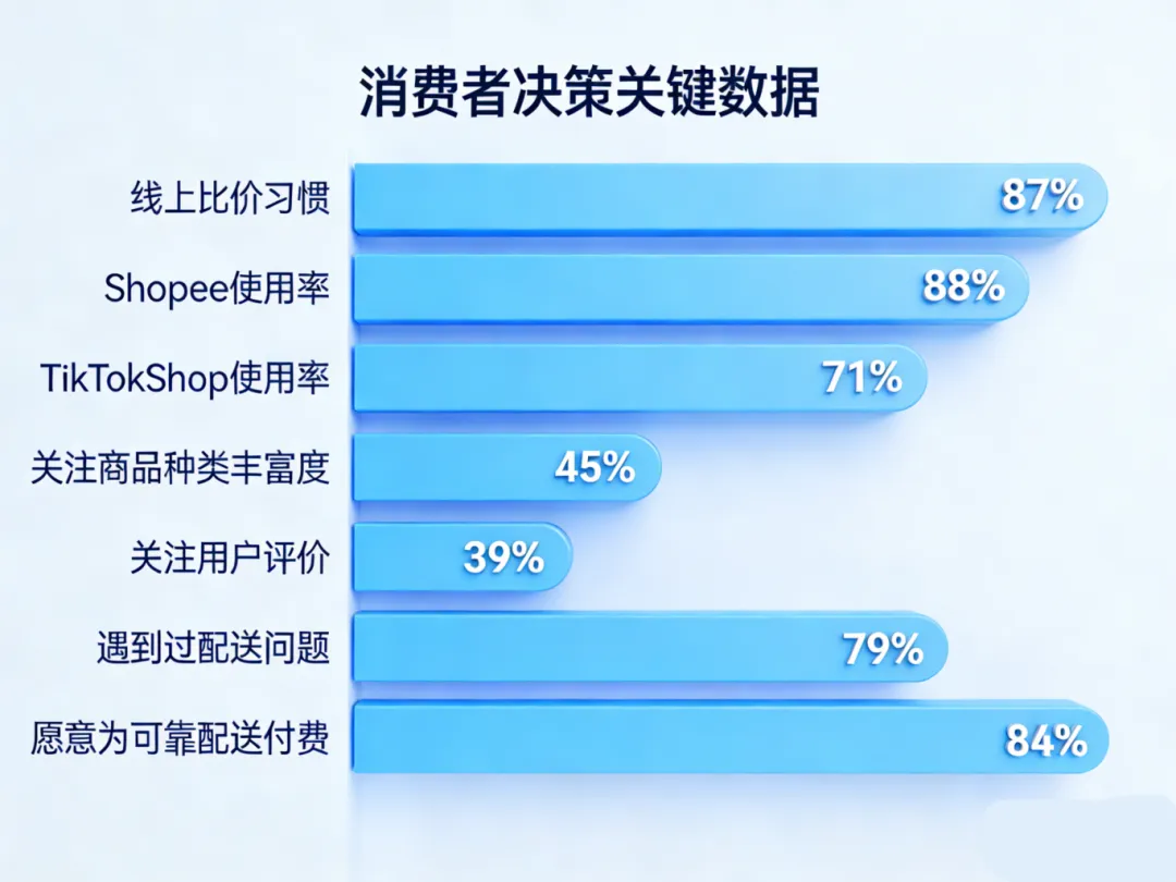 理性权衡:价值验证完成闭环:在泰国,87%的消费者习惯于线上比价,并倾向于使用Shopee(市场使用率高达89%)和Lazada等电商平台。他们特别关注商品的用户评价(39%)和商品种类的丰富度(45%)。此外,79%的消费者在购物过程中遇到过配送问题,这使得物流速度、可靠性和售后政策成为他们决策的关键因素。有84%的消费者表示愿意为更可靠的配送服务支付额外费用。