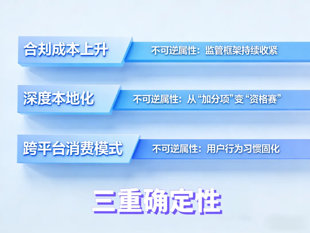 确定性二:深度本地化已从“加分项”转变为“资格赛”,其贯穿供应链(海外仓/本土备货)、产品(气候/文化适配)、运营(本地团队)、法律主体(本土公司)等全价值链环节,本地化根系的深浅决定了竞争壁垒的高低。