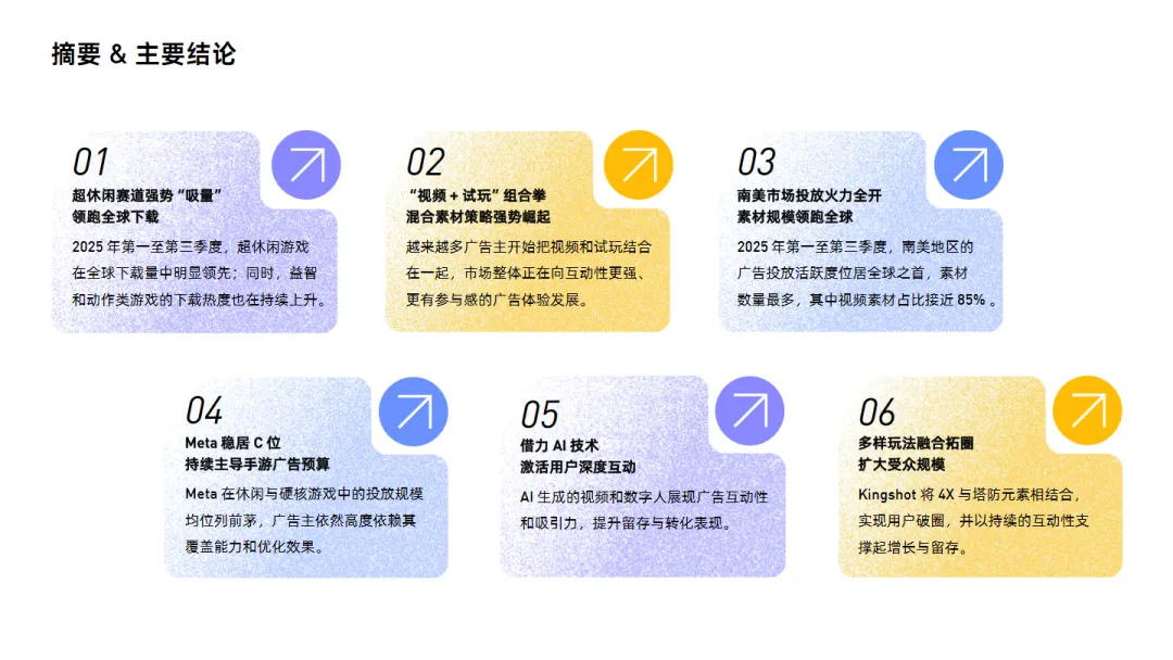 综上所述,2025年全球手游市场在超休闲游戏的带动下,下载量和收入均呈现出显著增长。同时,广告主在广告素材和渠道选择上更加注重互动性和参与感,南美市场和欧洲市场在广告投放上表现活跃,Meta平台在广告消耗上占据主导地位。这些趋势为手游市场的发展提供了重要的参考和洞察。