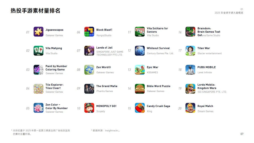2025年全球手游市场呈现出强劲的增长势头,其中超休闲游戏在全球下载量中表现尤为突出。根据Insightrackr的数据显示,2025年第一至第三季度,全球移动游戏下载总量预计达到389亿次,同比增长7.4%。