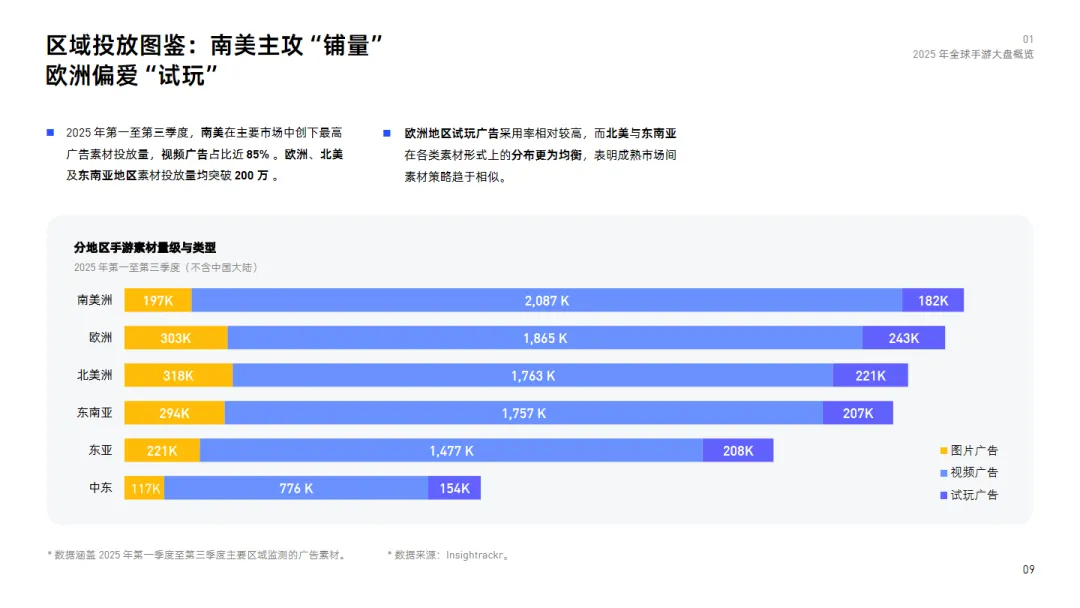 区域投放方面,南美市场的广告投放活跃度位居全球之首,素材数量最多,其中视频素材占比接近85%。欧洲、北美及东南亚地区的素材投放量均突破200万,显示出这些地区的广告市场活跃。