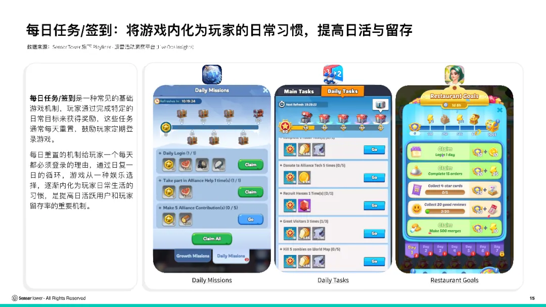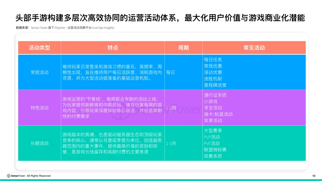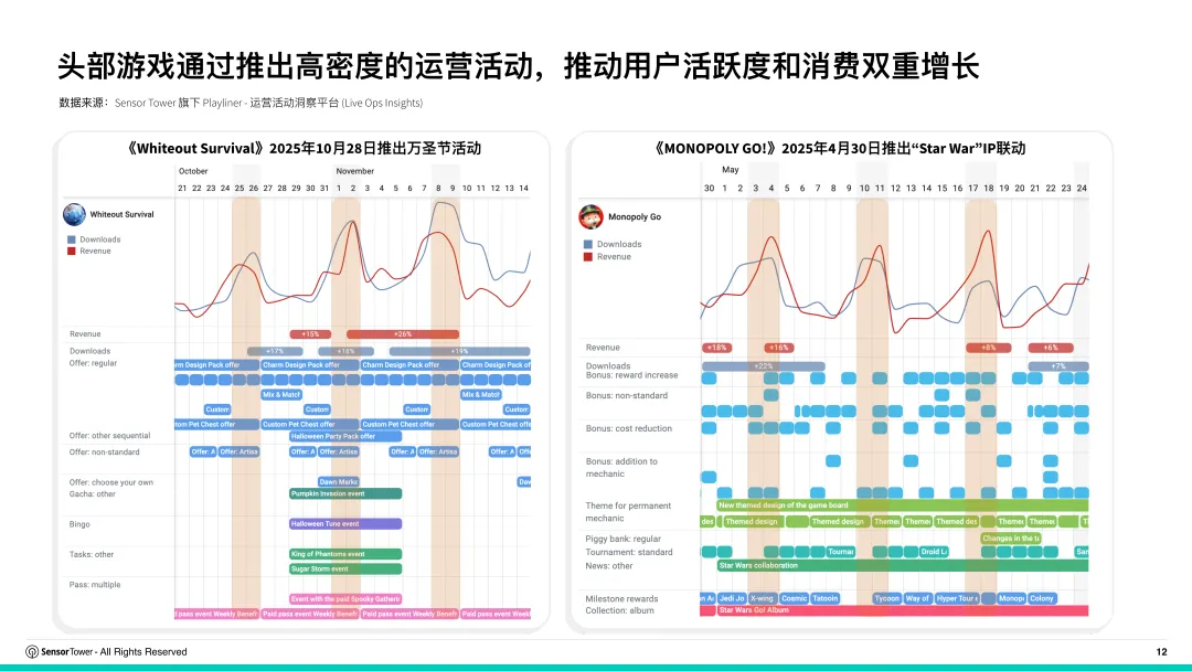 《2025年全球畅销手游运营活动洞察报告》由Sensor Tower发布,报告基于其Live Ops Insights平台数据,系统解析了全球头部手游通过构建“常规—特色—大型”三层级、高密度的运营活动体系(如通行证、节日主题活动、收集系统等),有效驱动用户活跃、留存与付费,并以《Whiteout Survival》和《Gossip Harbor》为例,揭示精细化运营是策略与解谜品类领跑市场、实现数十亿美元收入的核心引擎。未完……