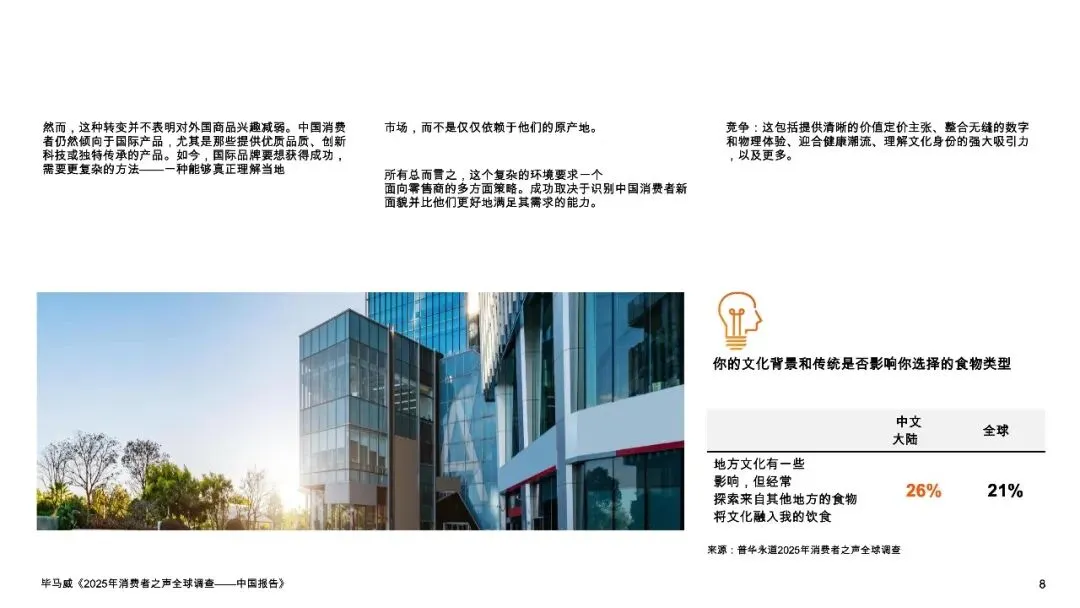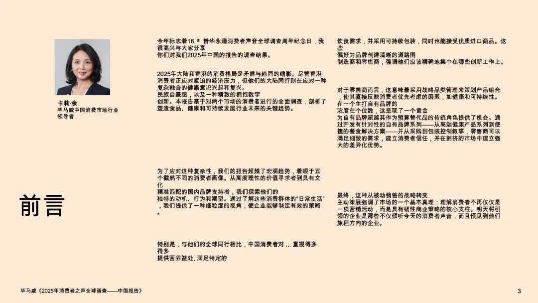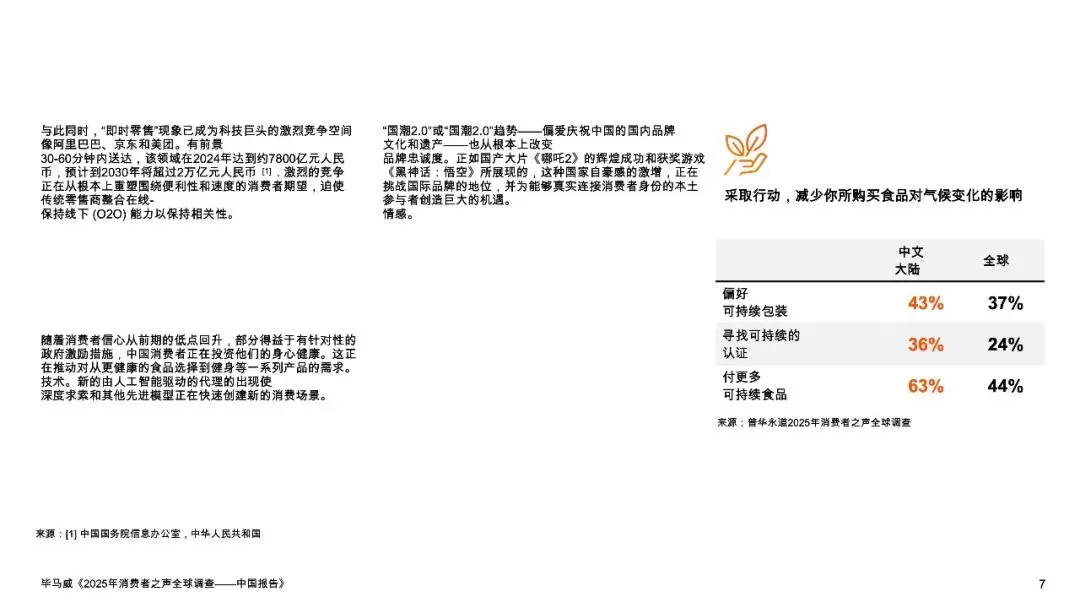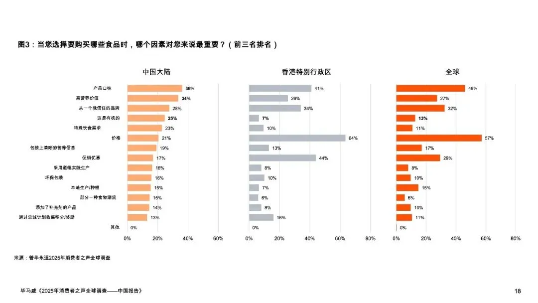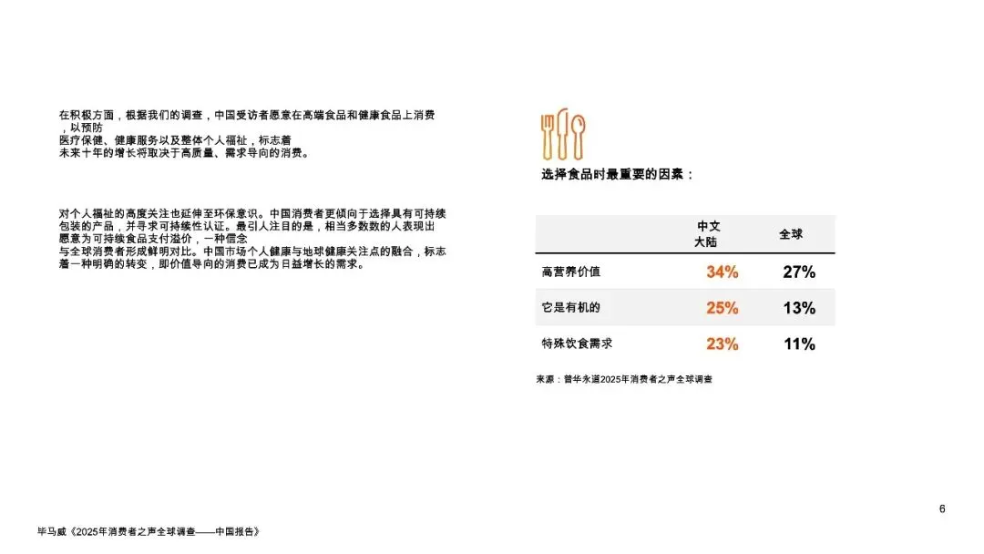 报告揭示了一个分裂又统一的消费图景:在宏观承压(45%家庭年收入低于1万美元)的背景下,34%的中国消费者将“高营养价值”作为食品选购首要因素,远超全球均值27%;同时63%的消费者愿意为可持续食品支付溢价,意愿领先全球近20个百分点。这背后是两股并行不悖的消费思潮——由经济压力驱动的“价值追寻者”正推动硬折扣零售爆发式增长,而注重健康与文化的“生态健康倡导者”和“国产品牌支持者”则支撑起高端健康食品和“国潮2.0”的市场崛起。