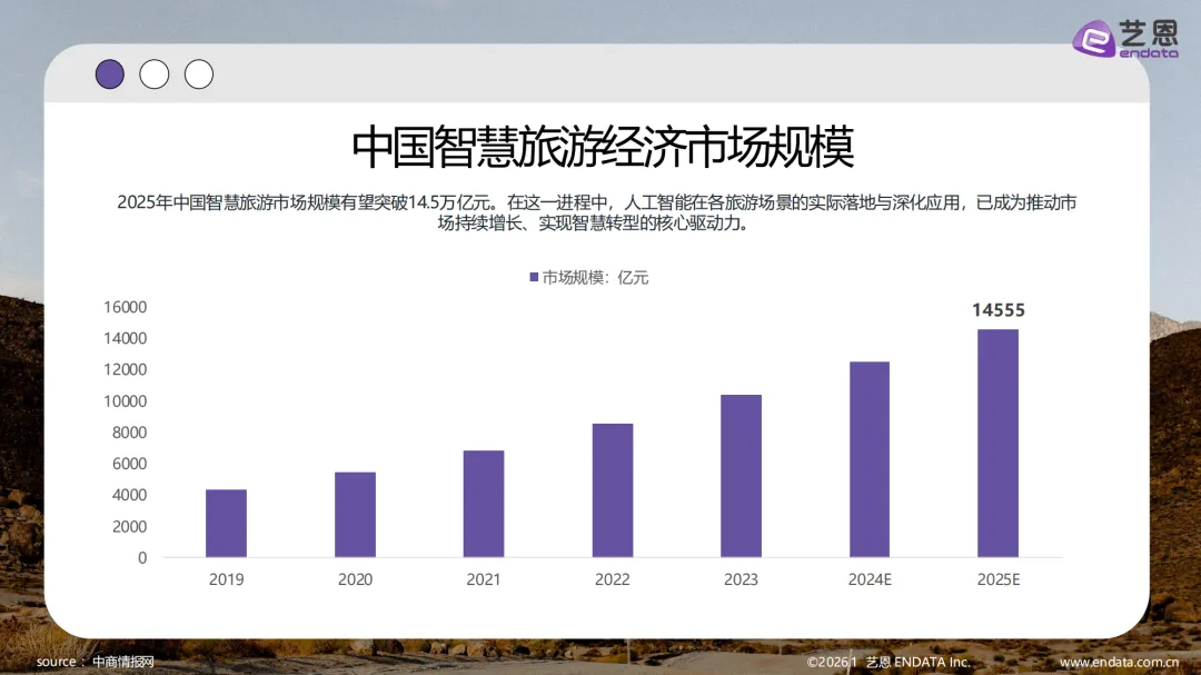 从市场规模来看,2025 年中国智慧旅游市场规模突破 14.5 万亿元,AI 技术成为核心增长引擎,底层算力突破与产业生态协同推动行业智能化转型。
