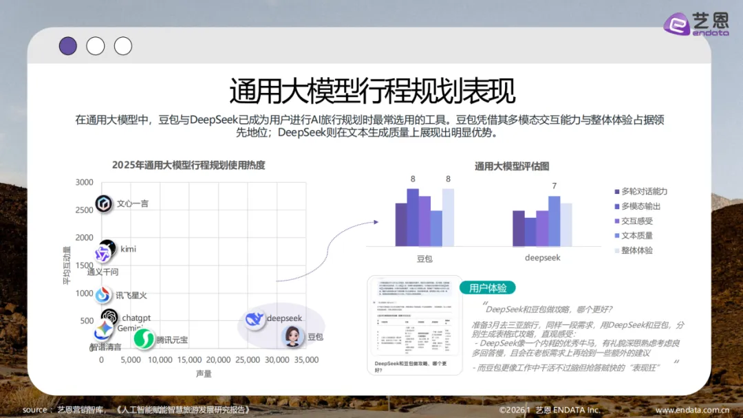 从技术生态来看,形成 “算力 + 模型 + 场景” 三层架构,通用大模型(DeepSeek、豆包)与垂类 OTA 助手(携程 “问道”、同程 “程心”)协同,构建开放联动的 AI 应用体系。