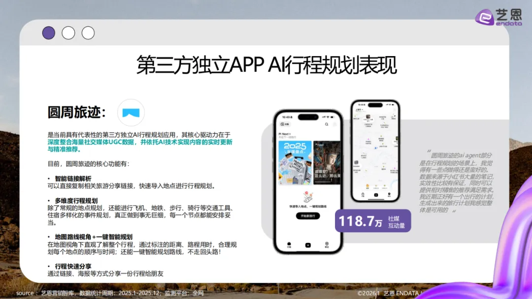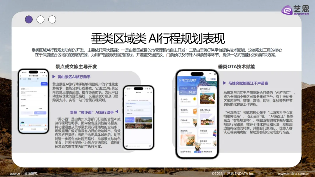 用户行程规划场景:形成五大工具类型,通用大模型(豆包、DeepSeek)擅长多模态交互与文本质量,OTA 助手(携程、同程)实现 “规划 - 预订” 商业闭环,第三方独立 APP(圆周旅迹)整合 UGC 数据,区域助手(黄山 AI 助手、贵州 “黄小西”)聚焦属地资源精准匹配。