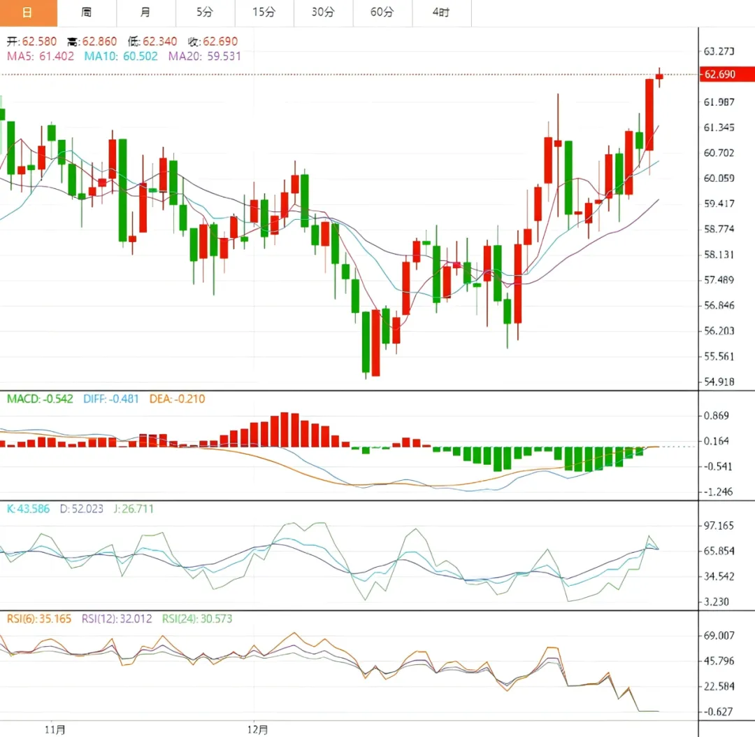 周三亚盘时段,WTI 原油延续涨势,交投于 62.50 美元/桶附近,成功突破关键箱体压力位,刷新自去年 10 月以来的高点。市场情绪明显转向谨慎,交易员开始重新评估地缘政治紧张与短期供应扰动对油价的持续影响力。