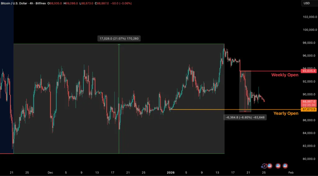观点:BTC在尝试突破$98,000失败后回撤超过10%,主要归因于 现货需求枯竭 (Spot Demand Faded) 和ETF流出的加剧。 宏观影响:美国消费者支出虽强劲但受通胀限制,美联储降息空间被压缩。地缘政治不确定性(如美国在格陵兰的战略动作)引发了短暂的波动率飙升,导致资本转向防御性资产。 阻力分析:上方阻力位不仅是技术性的,更是短期持有者成本基准(Cost Basis)所在,前期买家在此处的解套抛压形成了“脆弱的平衡”。 Glassnode (链上分析):