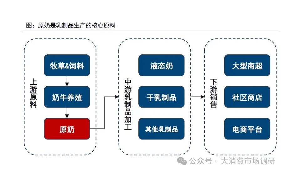 ➢ 原奶是乳制品产业核心原料。原奶由奶牛直接产出,经中游乳制品企业加工成液态奶(消耗60-70%原奶)、干乳制品(消耗30-40%原奶),然后通过下游商超、电商等渠道实现成品销售。