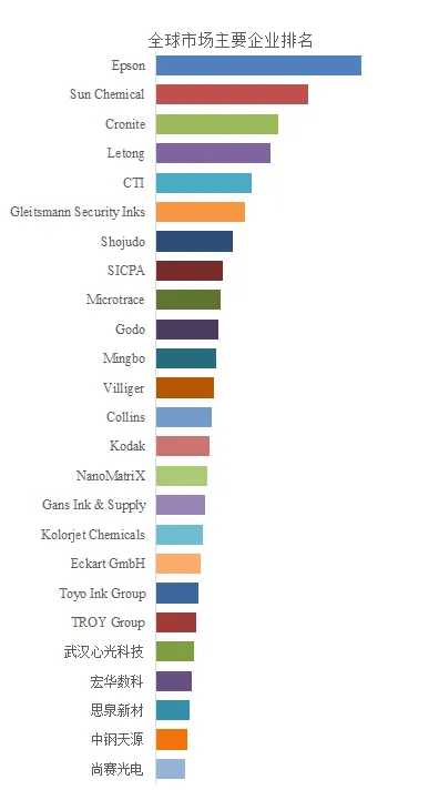 重点关注全球磁性墨水市场的主要企业,包括:Epson、 Sun Chemical、 Cronite、 Letong、 CTI、 Gleitsmann Security Inks、 Shojudo、 SICPA、 Microtrace、 Godo、 Mingbo、 Villiger、 Collins、 Kodak、 NanoMatriX、 Gans Ink & Supply、 Kolorjet Chemicals、 Eckart GmbH、 Toyo Ink Group、 TROY Group、 武汉心光科技、 宏华数科、 思泉新材、 中钢天源、 尚赛光电。
