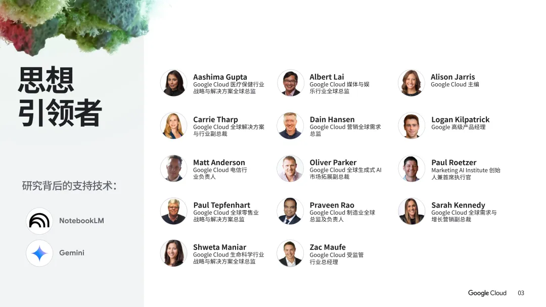 03 重点行业应用案例零售:Best Buy用AI虚拟助理缩短问题解决时间,零售商聚焦创意服务Agent生成营销内容,个性化推荐提升转化。 医疗健康:Bayer用AI优化放射科工作流,Prudential通过MedLM简化医疗索赔处理,Mayo Clinic借助Vertex AI Search加速临床数据检索。 制造:Elanco通过Vertex AI框架实现190万美元ROI,制造商用AI分析多模态传感器数据预测设备故障,优化生产流程。 金融服务:Discover Financial为10000名客服提供AI工具,银行聚焦AI赋能KYC流程,提升风险评估效率。