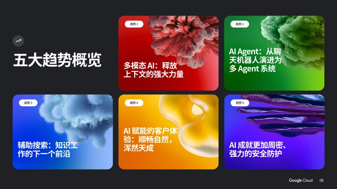2025年AI商业趋势报告:五大趋势重塑商业格局!《Google Cloud 2025年AI商业趋势报告》显示,AI从实验阶段迈向规模化应用,多模态、AI Agent等技术推动企业运营变革,成为企业竞争核心驱动力。