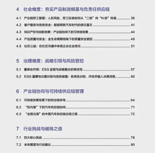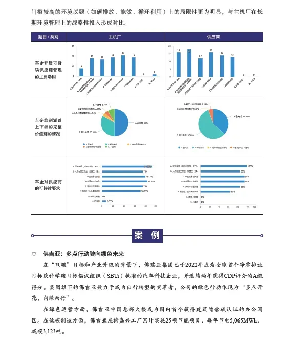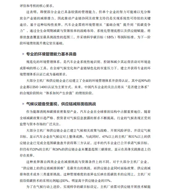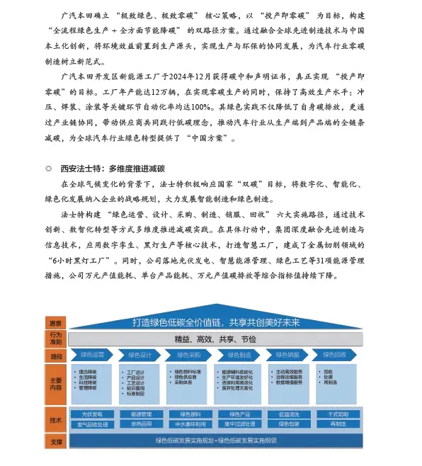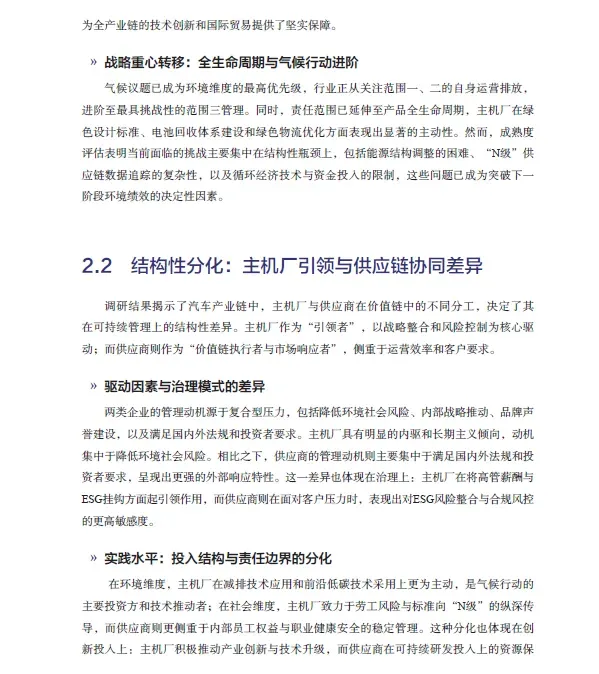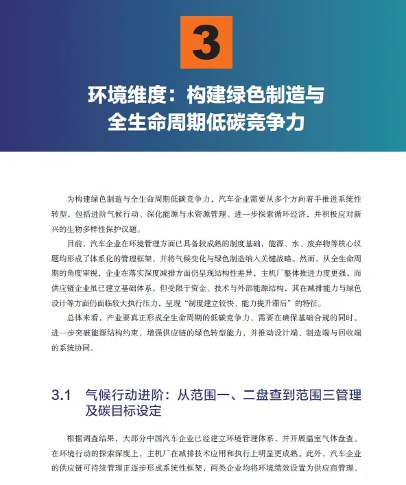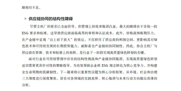 报告针对不同主体提出行动建议。 针对主机厂,建议制定供应链赋能路线图,将ESG风险管控前置,并强化技术协同以破解碳排放管理难题;针对供应商,鼓励主动对标国际标准,通过专业化和技术创新提升绿色竞争力;针对政策制定者,呼吁构建支持高质量发展的产业生态,包括推动60天账期制度落地以缓解行业内部卷。