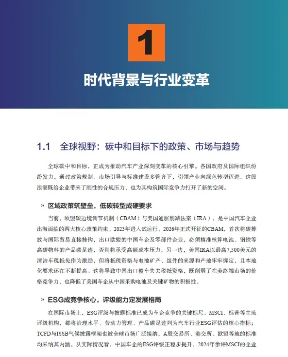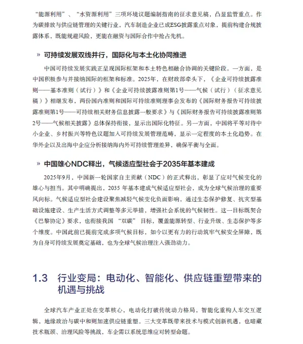 面向“十五五”,中国汽车产业《节能与新能源汽车技术路线图3.0》已然绘制。《路线图》明确提出,“电动化、低碳化技术进入发展快车道,推动车用能源结构发生革命性变化;以人工智能为核心的智能化技术快速迭代、深度赋能,推动汽车从传统交通工具进一步转型升级,并带来技术创新范式、生产制造方式、销售服务模式的重大变革;电动化、智能化、低碳化技术的深度融合,推动汽车产业链、创新链、价值链向交通、能源、信息通信等领域加速拓展,驱动汽车产业生态全面重塑。”在可持续发展的道路上,能源结构变革、智能化快速迭代等一系列命题,伴随着可持续发展信息披露和全球汽车行业政策引领,将一步步深刻影响我国汽车行业。