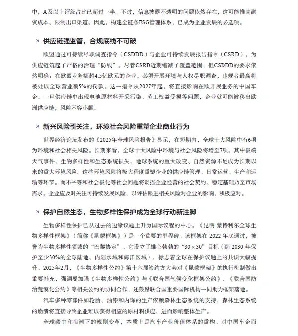 · 将ESG风险管控前置化,筑牢出海合规防线。针对欧盟CSDDD等法规,主机厂需要将尽职调查范围向上游延伸至关键矿产层面。通过开展供应商ESG风险评级,对高风险供应商实施差异化审核与重点帮扶。同时,积极布局海外本地化供应链,与国内核心供应商“组团出海”,共同应对地缘政治风险,并将中国的成本效率优势与当地的绿色能源、合规要求相结合,打造全球竞争力。