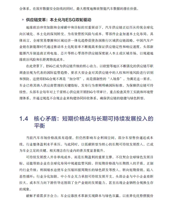 报告核心内容涵盖汽车行业可持续发展全景、关键挑战与未来趋势。 蓝皮书描绘了中国汽车ESG管理全景,识别出环境、社会与治理三大维度的关键议题:环境方面,行业需聚焦气候行动和范围三碳排放管理,但面临能源结构约束和供应链绿色转型障碍;社会方面,企业普遍重视员工权益和产品质量,但在供应链劳工标准、人权风险等深层议题上管理深度不足;治理方面,董事会监督和ESG风险管理机制逐步完善,但需进一步将ESG目标融入战略决策。行业面临的核心矛盾包括价格战挤压利润与长期可持续投入的冲突、供应链协同中的成本与标准分化问题,以及出海合规风险(如国际绿色贸易门槛)。未来五年,报告预测三大趋势:强制性ESG信息披露将成为常态、主机厂需发挥“链主”作用构建韧性低碳供应链、供应商应将合规要求转化为价值创造机遇。