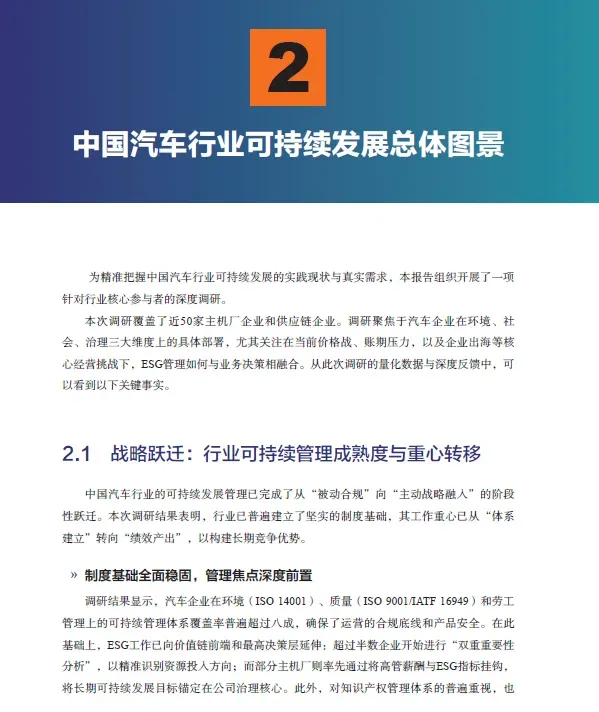 报告强调可持续发展对汽车产业的重要性。 在全球政策约束和产业变革背景下,可持续发展已成为提升企业全球竞争力的关键,报告呼吁行业以系统思维应对转型挑战,推动全生命周期低碳化与全球化布局。