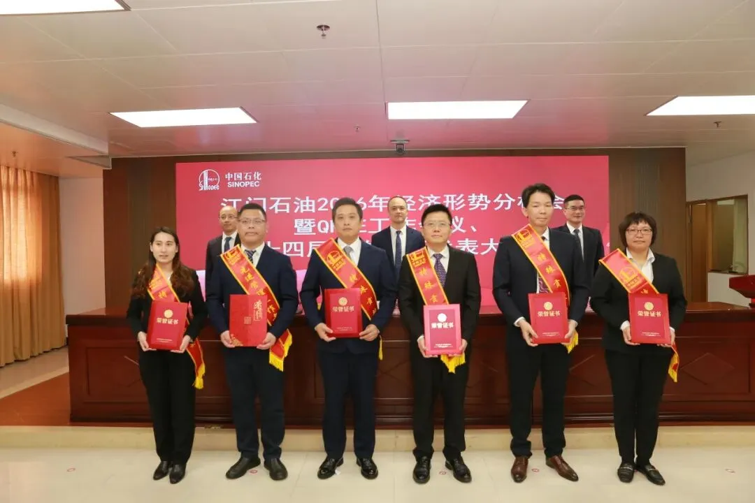 江门石油党委书记、分公司代表郑吉多作题为《坚定创新驱动,深化改革转型,以团结奋进姿态谱写高质量发展新篇章》的主题报告、《精准管控强根基,科创赋能促转型,以高水平安全护航公司高质量发展新篇章》的QHSE工作报告。工会主席、副总经理张位锋主持会议。会上对2025年度先进集体和先进个人进行表彰和颁奖。