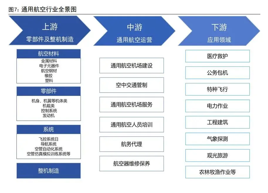 从全产业链看,通用航空上游主要包括航空器研发制造,中游主要为通用航空运营服务,下游则是市场应用与综合保障环节。航空器研发制造包含原材料、零部件及整机制造。通航运营包含飞行活动运营、机场建设与管理、空中交通管制以及航空器保养维修等服务支撑体系。通用航空应用场景包括工业、农林牧渔业、建筑业、服务业等。