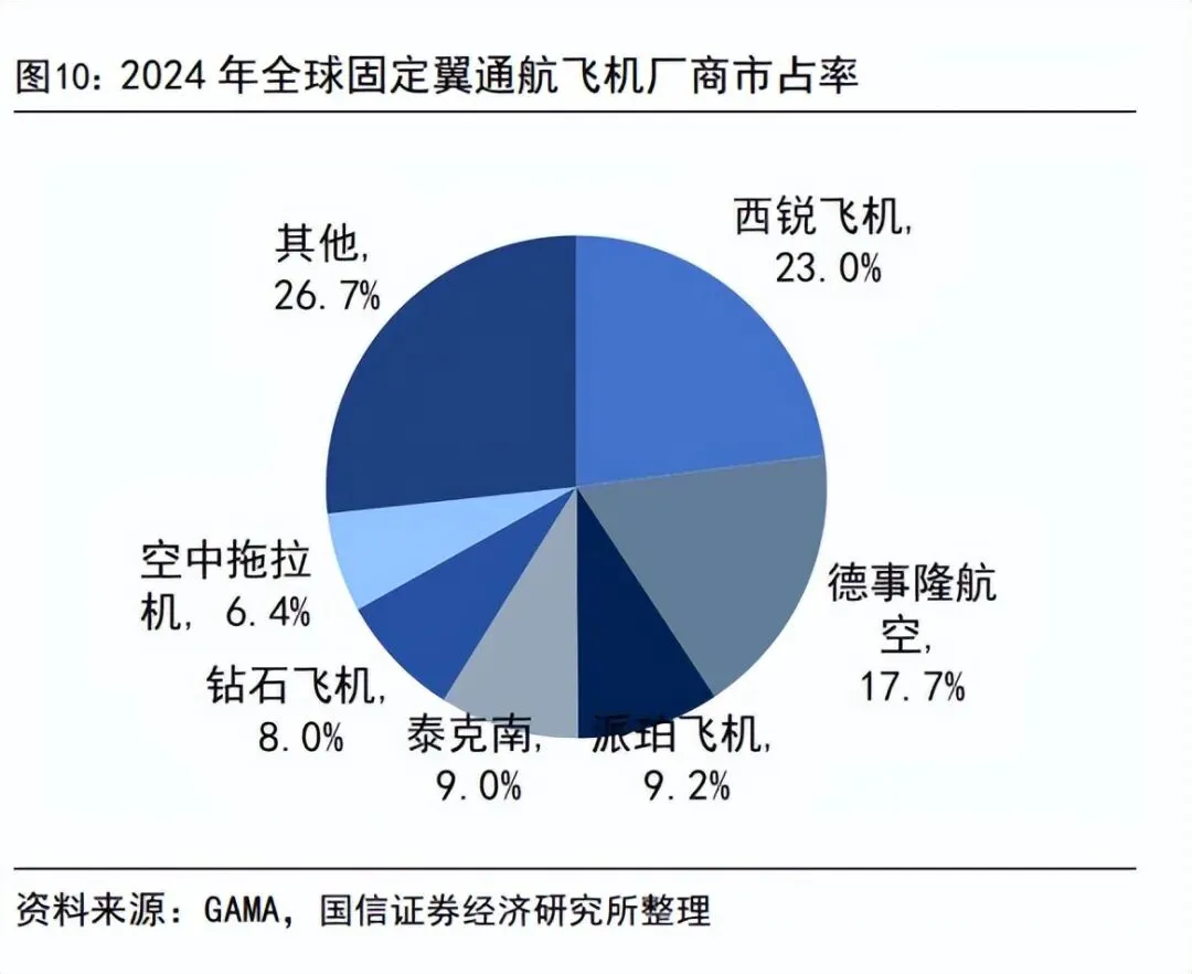 传统通航航空器制造目前由欧美企业主导,市场集中度高。从市占率来看,2024年全球固定翼通用飞机交付量 3162 架,前六大厂商占比为73.3%。其中总部位于美国的西锐公司(Cirrus)交付 731 架,占 23%;美国德事隆航空(Textron)交付 559 架,占 17.7%;美国派珀飞机公司(Piper Aircraft)交付291 架,占9.2%;意大利泰克南公司(Tecnam)交付 283 架,占 9.0%;由我国万丰奥威集团收购的总部位于奥地利的钻石飞机(Diamond)交付 252 架,占8.0%;美国空中拖拉机公司(Air Tractor)交付 202 架,占 6.4%。
